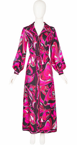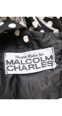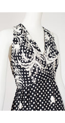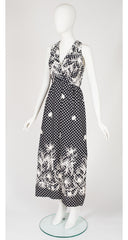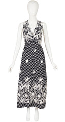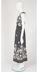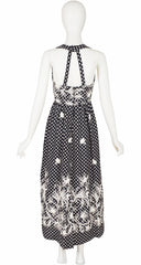 This Morton Myles for Malcolm Charles maxi dress dates to the late-1960s/early-1970s. It's made from black cotton with a white polka dot and floral embroidery. The top is lined and the skirt is unlined. The back has a cut-out, a Lightning zipper up the back of the skirt, and two hook-and-eyes at the back of the neck. It is missing the original belt, but it's otherwise in excellent condition, clean and ready to wear.