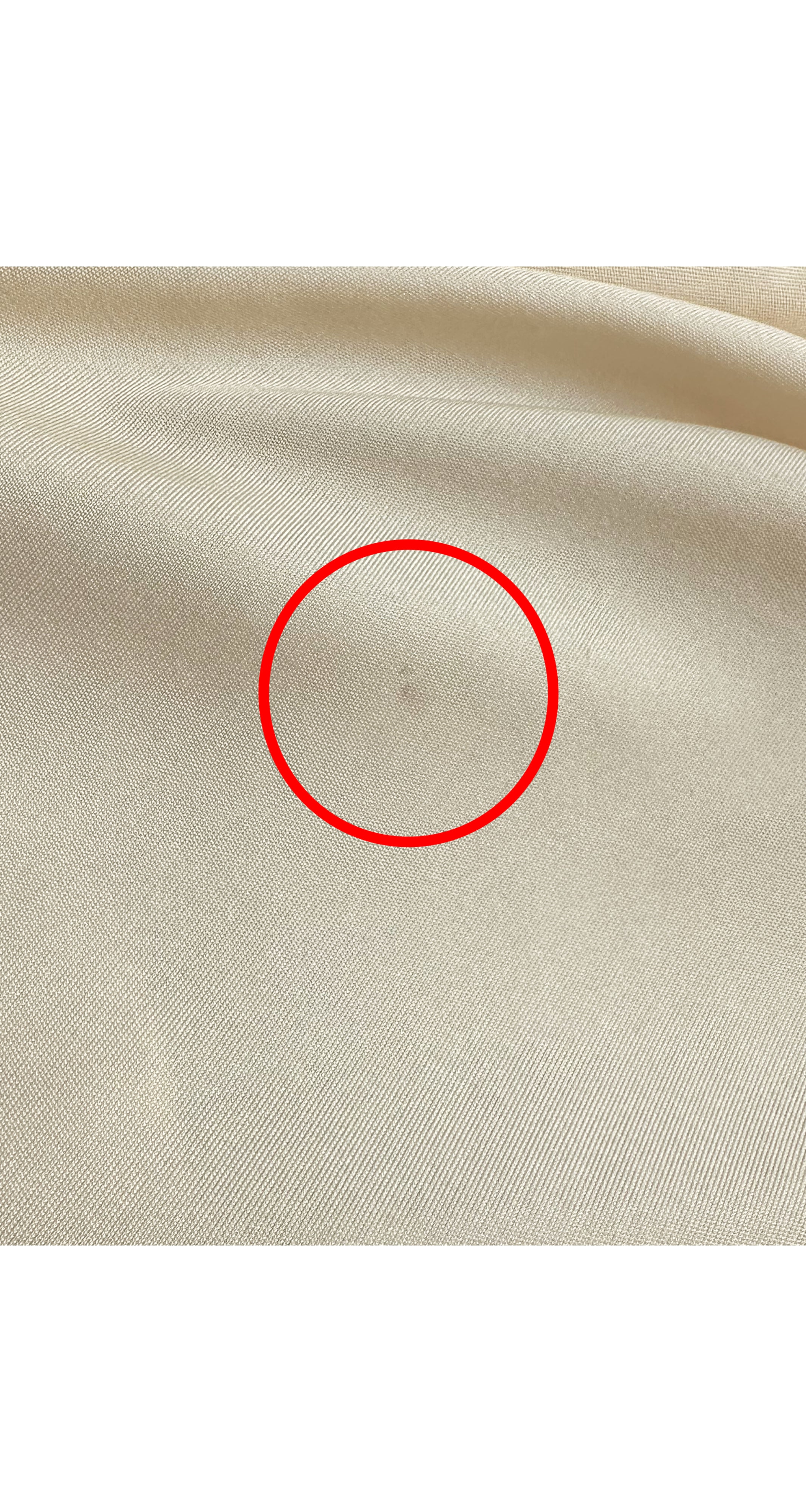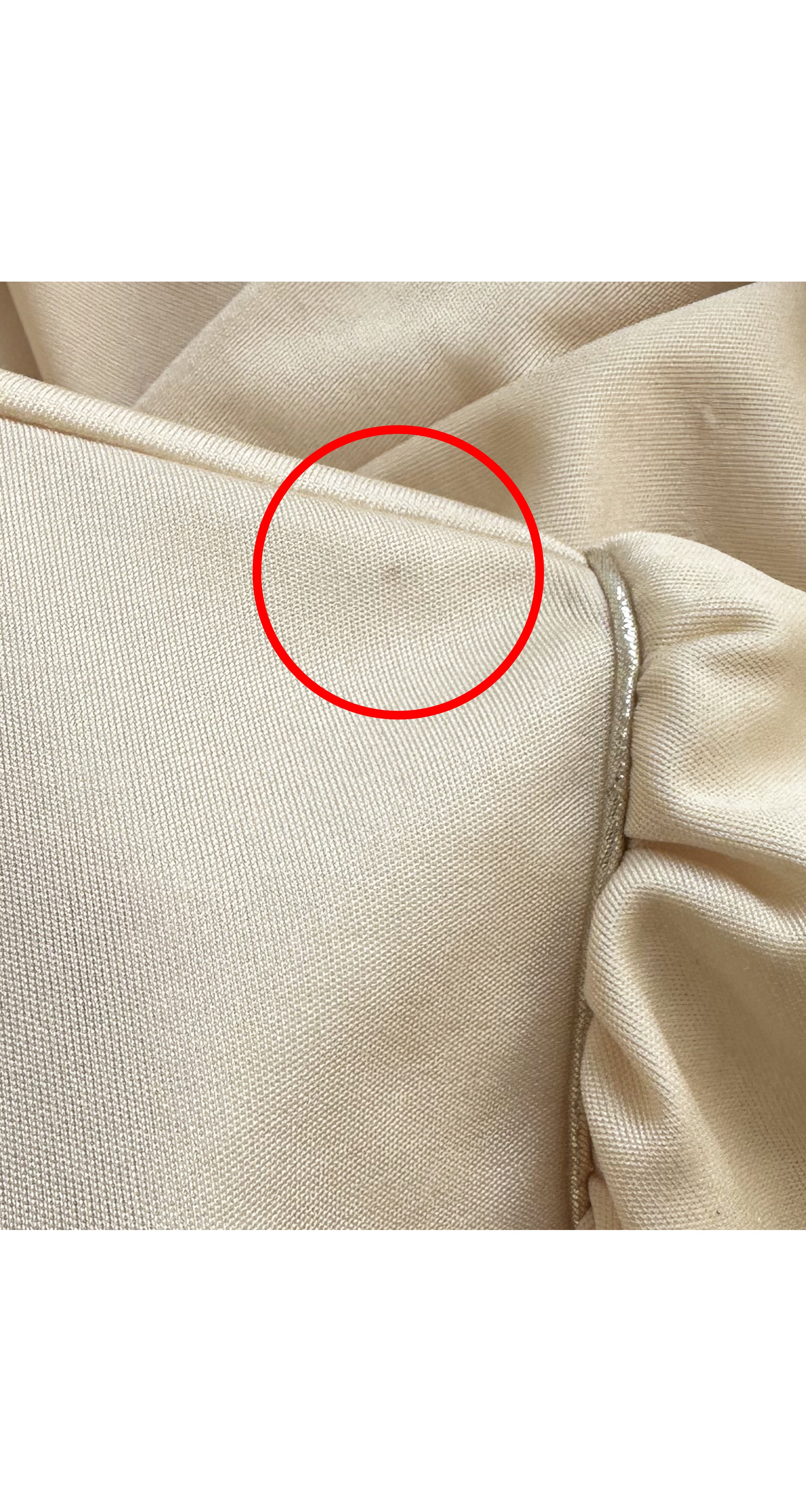 This early-1980s Bill Tice evening dress was made in the USA of unlined cream nylon jersey with gold metallic trim. It has long sleeves and a plunge neckline, with the fabric gathers around a lurex knot at the waist, creating a flattering silhouette. It slips over the wearer's head with no fasteners. There are two pinholes on the left side of the bust and a few very discreet small brown specks, but it presents well and is otherwise in very good condition, clean and ready to wear.