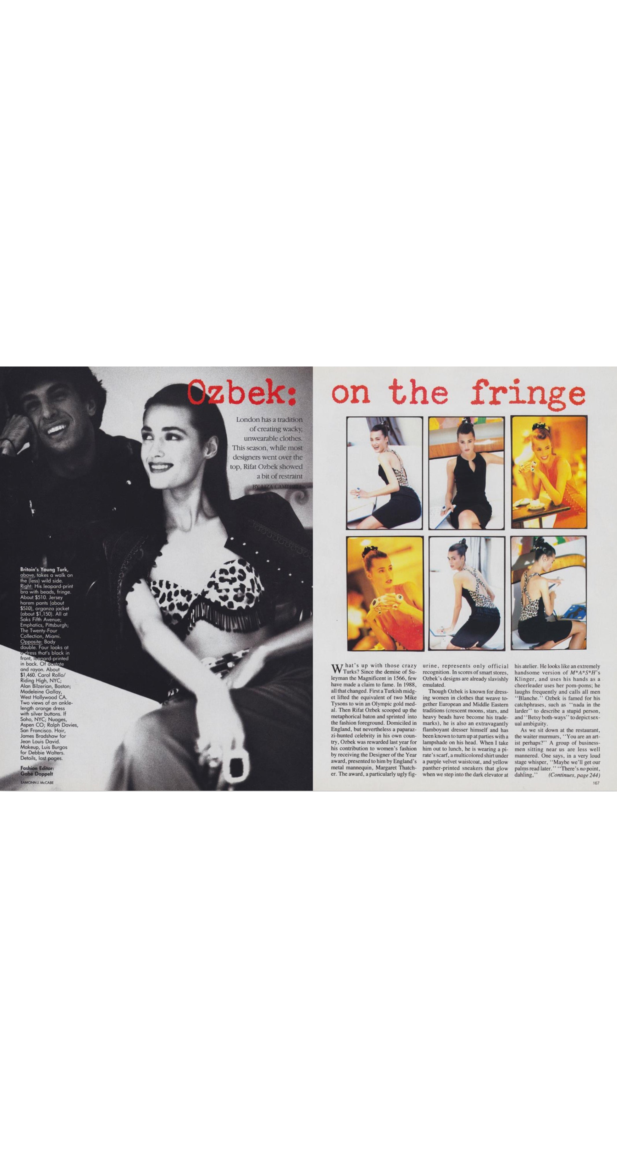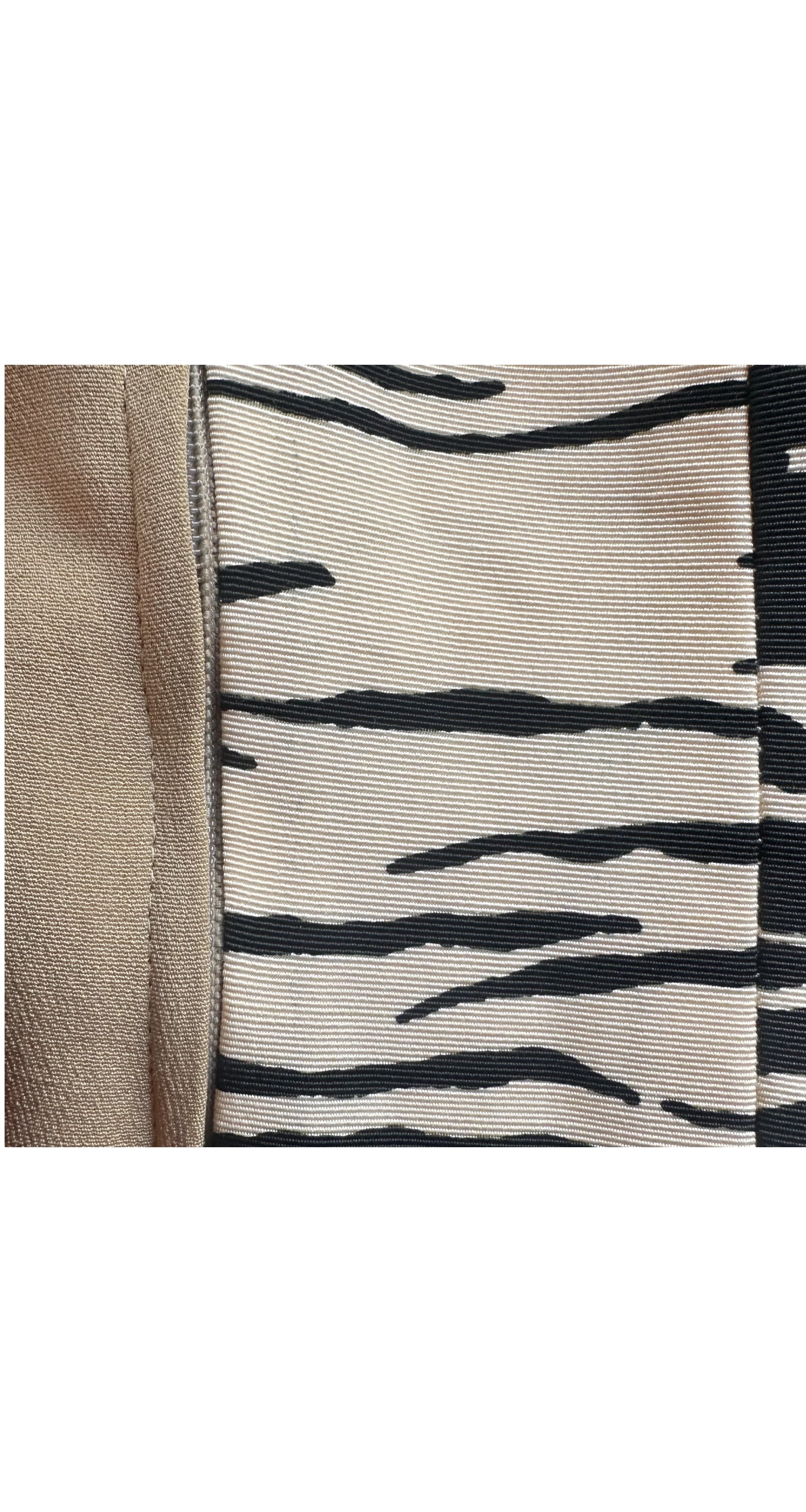 This 1989 S/S Rifat Ozbek sleeveless cross-back mini dress was made in Italy of a tan 62% acetate/38% rayon blend with a zebra print back and beaded fringe at the back of the waist. Versions of the dress was featured in the January 1989 issue of Vogue US and on the runway. It retailed for $1460 in 1989 (approximately $3800 USD today.) It has a v-neckline, a 3.5" slit up the back of the skirt, and a zipper fastening the left side. There are a couple very light marks on the zebra print but it's otherwise in excellent condition, professionally dry-cleaned and ready to wear.