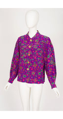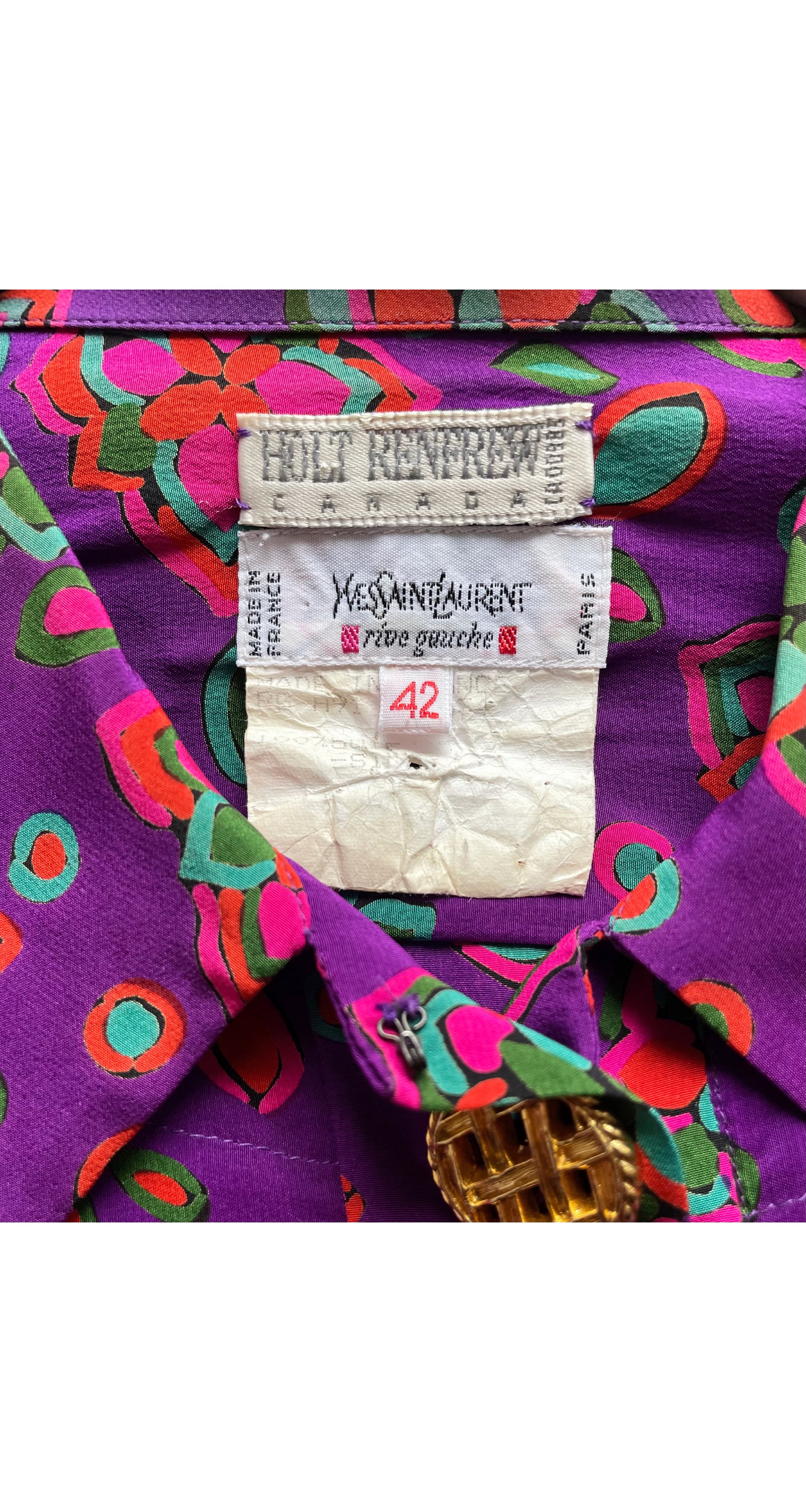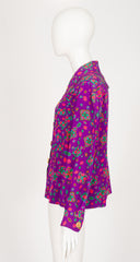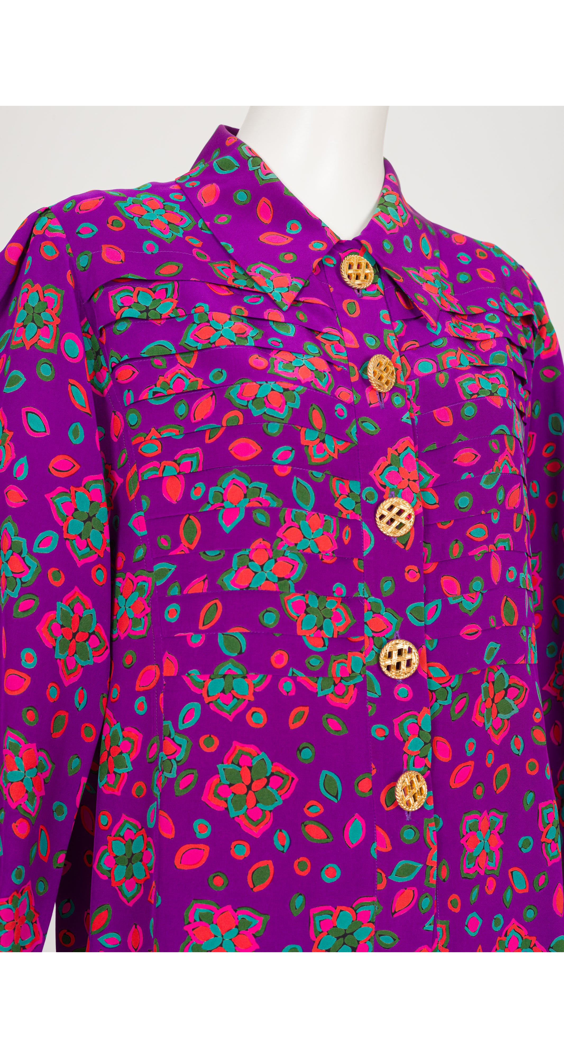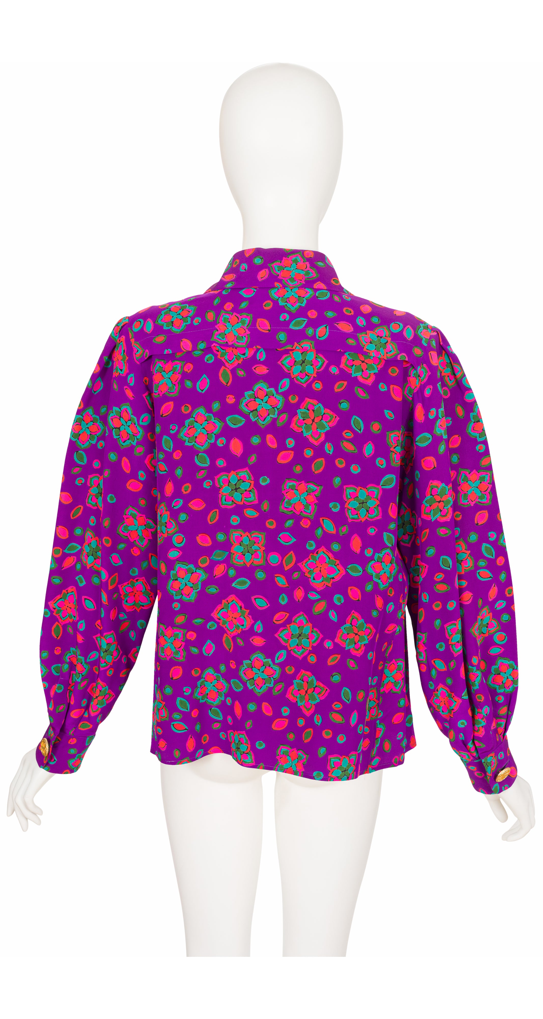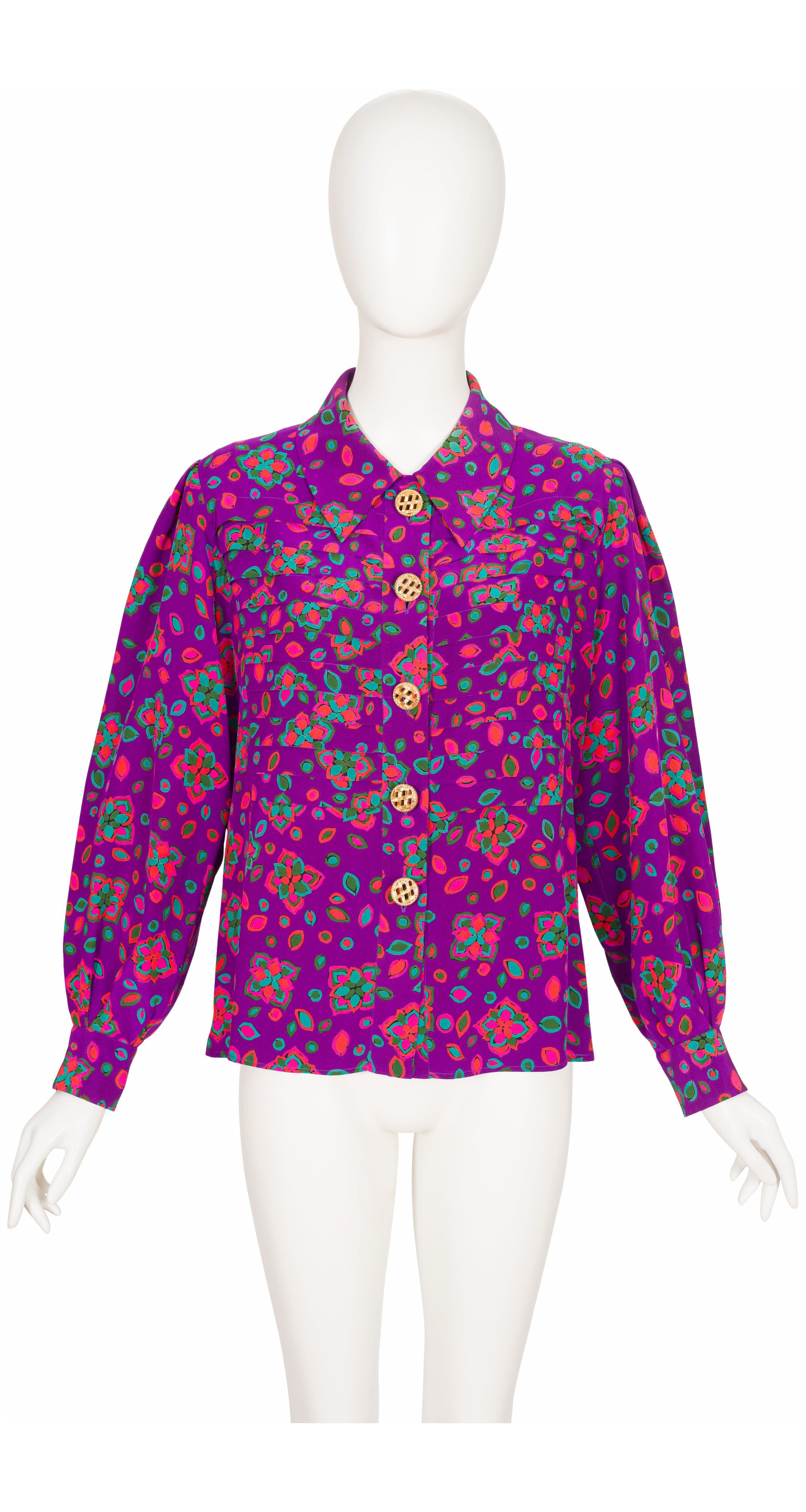 This 1990s Yves Saint Laurent Rive Gauche blouse was made in France of purple silk with an orange, pink, and green floral print and originally sold at Holt Renfrew. It has voluminous sleeves, pleating down the front, and a pointed collar. It fastens with five gold-tone plastic buttons in the front and one on each cuff. We believe that the buttons aren't original, but it's otherwise in excellent condition, professionally dry-cleaned and ready to wear.