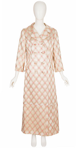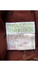 This 1980s Emmanuelle Khanh blouse was made in France of unlined mahogany silk with a black diamond pattern throughout. It features a built-in neck tie and ruched yoke. It fastens with two buttons at the waist and one on each cuff. It's in excellent condition, has been professionally dry-cleaned and is ready to wear.