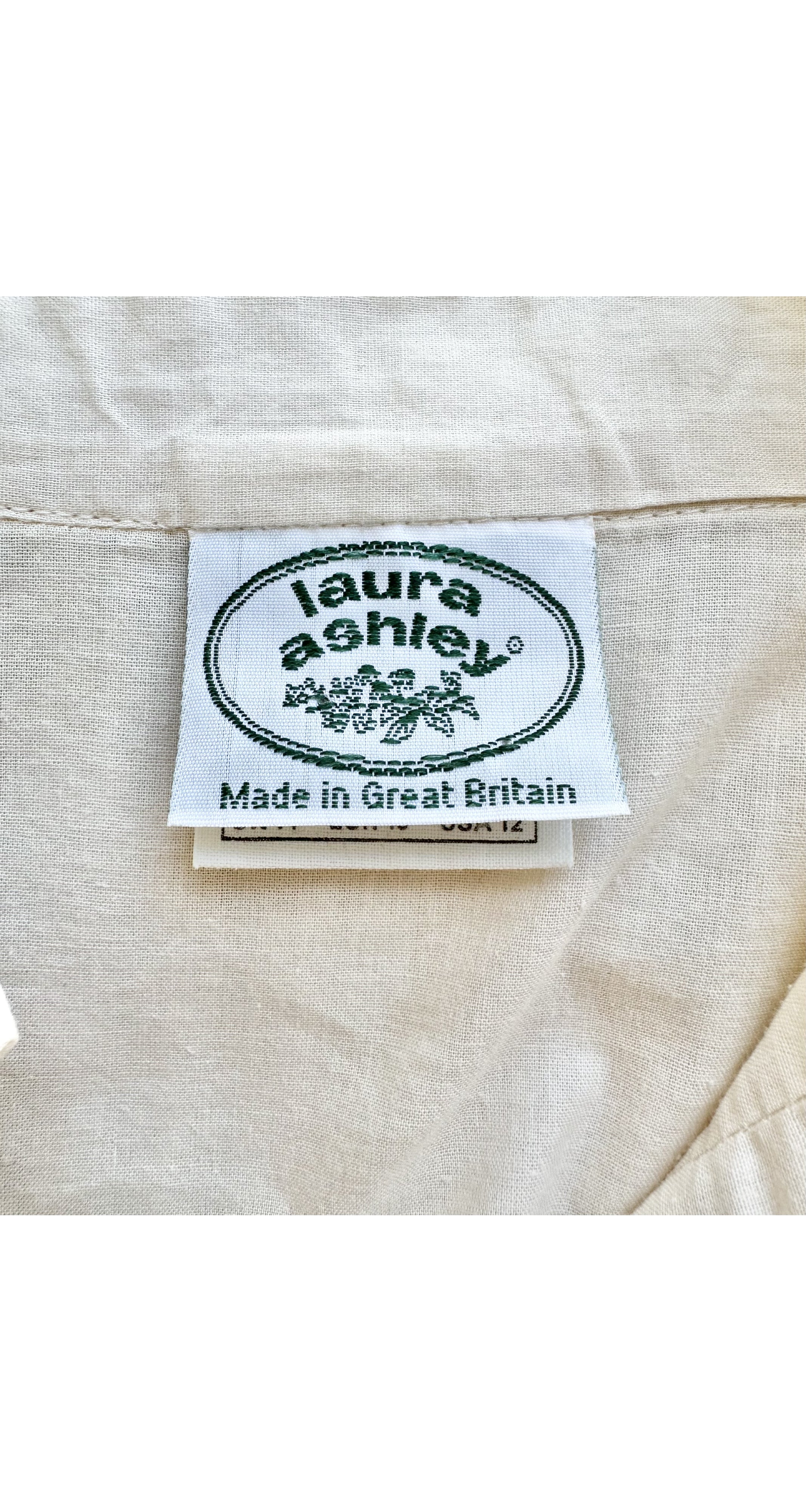 This 1980s Laura Ashley Victorian-style blouse was made in Great Britain of cream cotton with lace insets. It features leg-of-mutton sleeves with 9.5" long cuffs, a high collar with ruffle trim, and pintuck detailing. The blouse fastens with 15 shell buttons in the front and two on each cuff. It's in very good condition, clean and ready to wear.