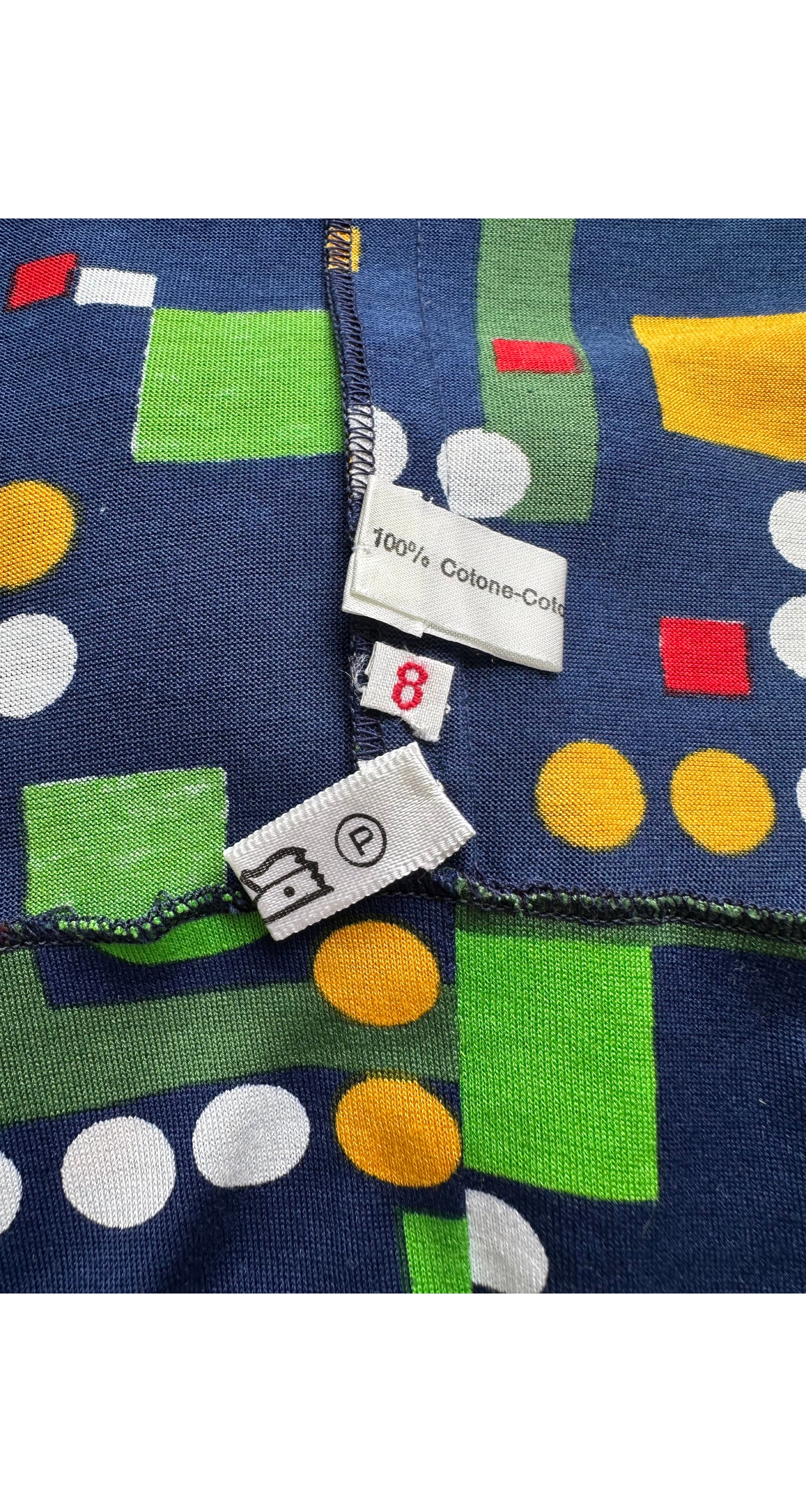 This 1970s V-neck low-back maxi dress is missing its designer label, but it's made from a very high quality navy blue cotton jersey with a green, yellow, red, and white floral geometric print. It features a halter neck with a red plastic ring at the back of the neck, ribbed knit trim, and a built-in belt that can be tied at the front or back. It fastens with a zipper at the back of the skirt. There is a small hole in the knit neckline where a brooch was worn, but the dress is otherwise in excellent condition, clean and ready to wear.