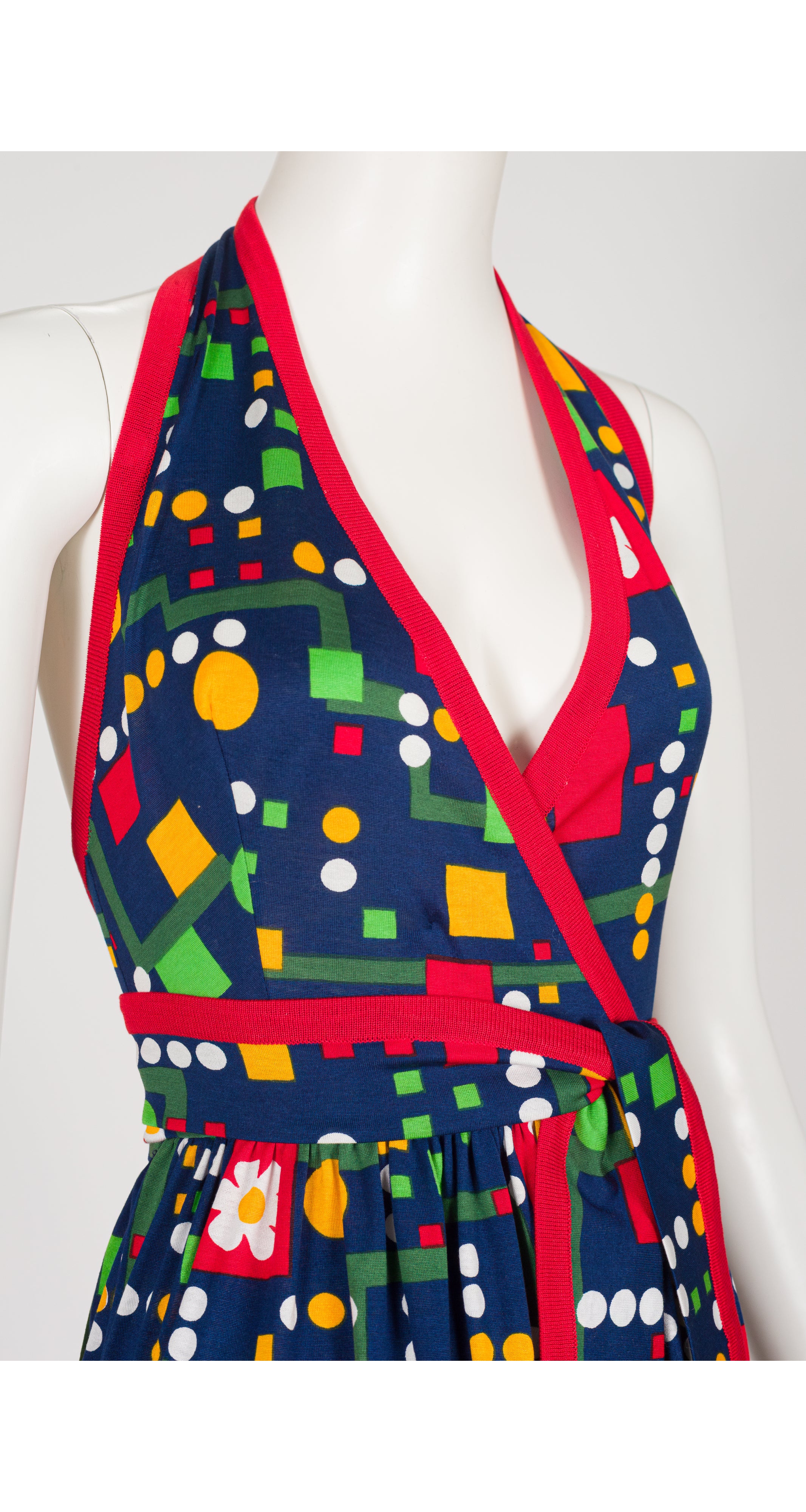1970s Floral Geometric Print Cotton Jersey Halter Maxi Dress