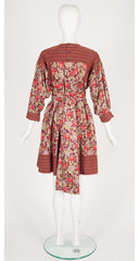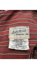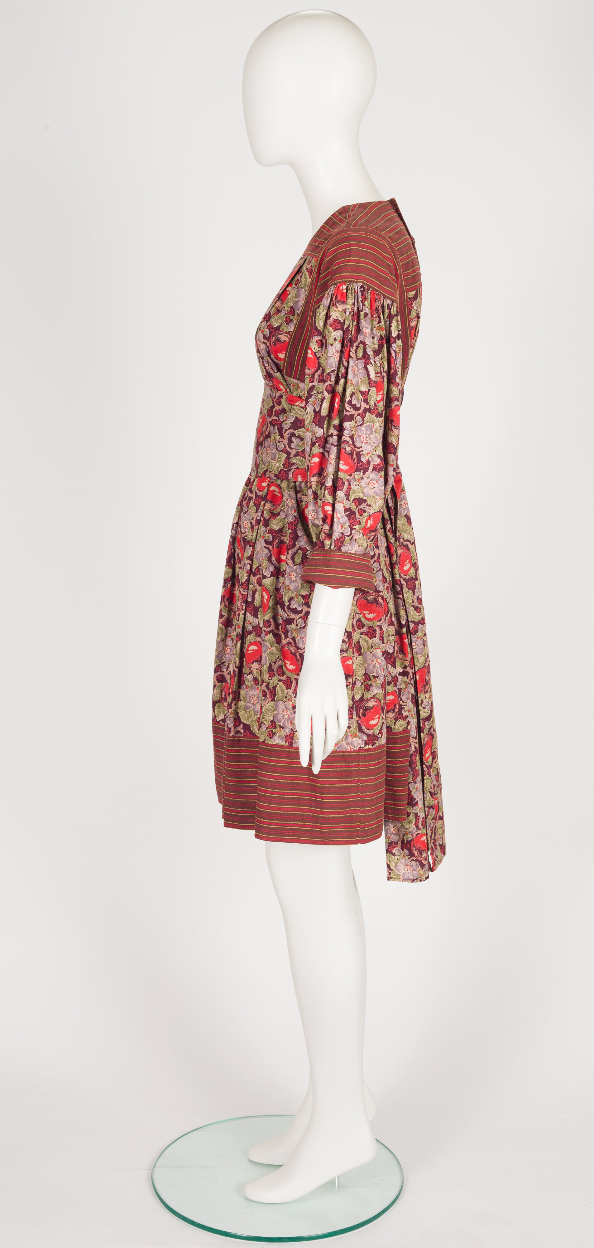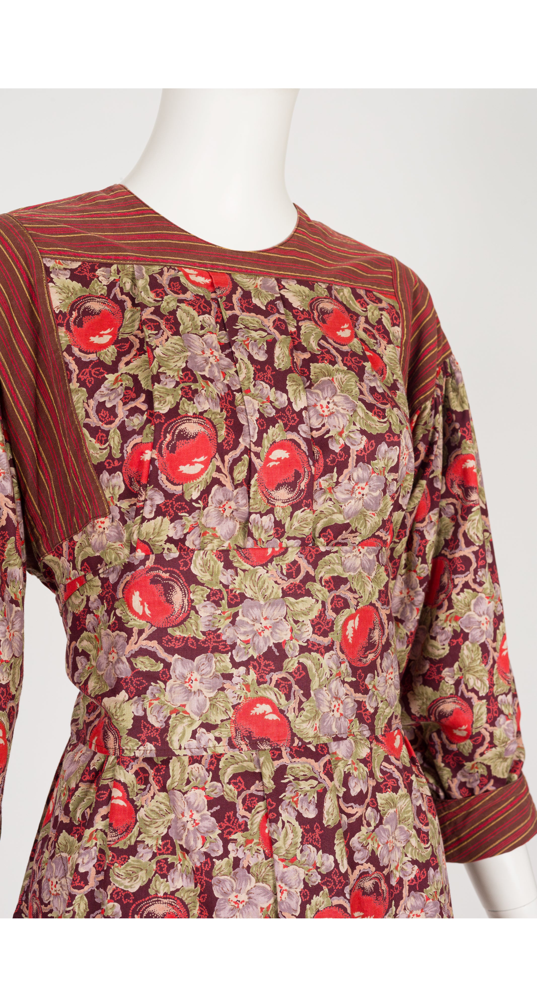 This late-1970s/early-1980s Anastasia Paris dress was made in France of unlined burgundy cotton with an apple tree print and striped trim. The 3/4 length sleeves have cuffs that can be rolled up. There's pleating down the front and back. The dress slips over the wearer's head, fastening with three buttons at the back, and can be cinched with a matching 84" long x 10" wide tie belt. It's in very good condition, clean and ready to wear.