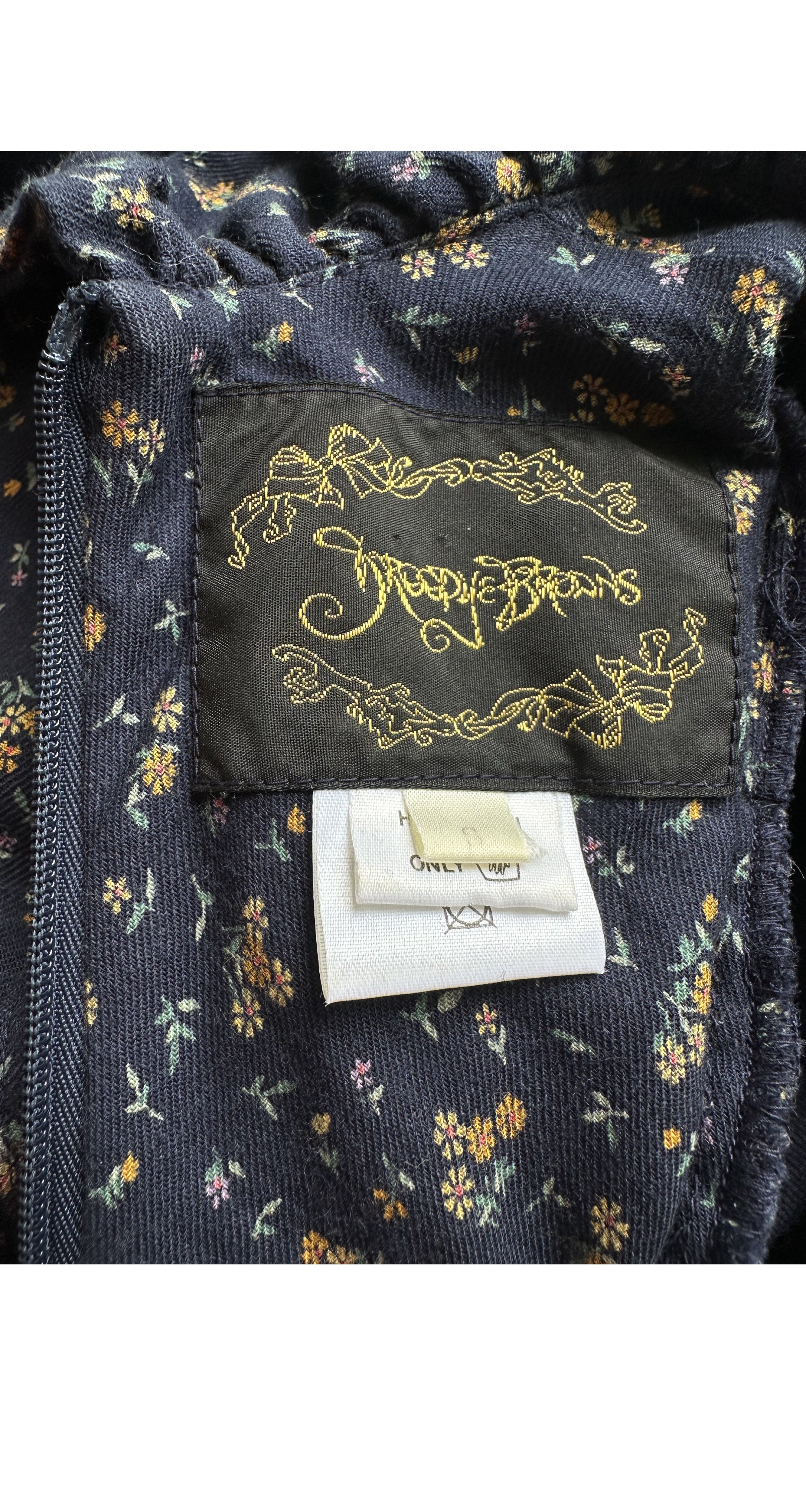 This 1980s Droopy & Browns Victorian-inspired maxi dress was made in the U.K. of floral print unlined cotton that feels similar to fine flannel. It features leg-of-mutton sleeves with 10.25" cuffs that fasten with 7 fabric-covered buttons. It also has a dramatic ruffle collar and detailing on the top, a 3" wide adjustable belt, and two front pockets. The dress fastens at the back with a concealed zipper. It's in excellent condition, clean and ready to wear.