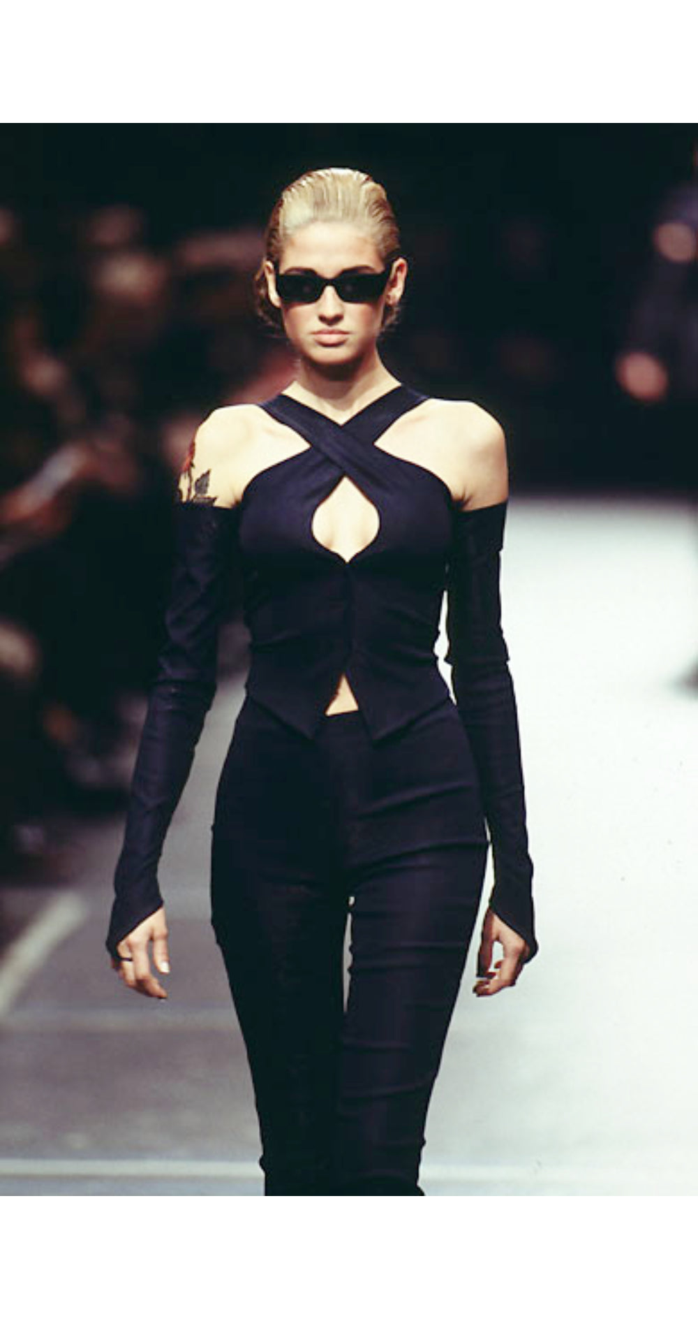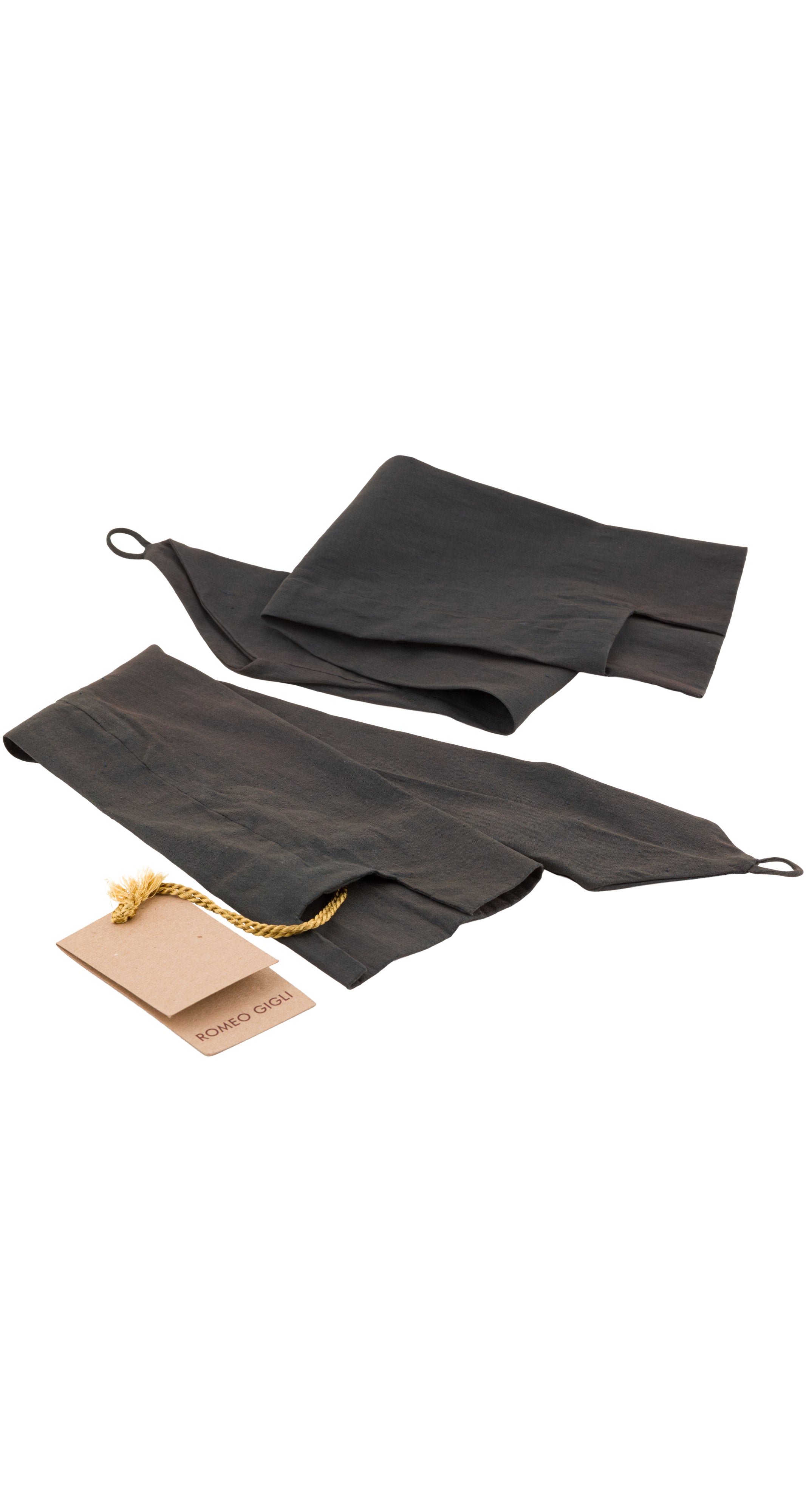 These 1996 S/S Romeo Gigli long finger-hook opera gloves were featured on that season's runway in multiple colors and fabrics. These were made in Italy of a gray 73% linen/20% nylon/7% spandex blend. They can cover the entire arm, rolling down at the top. The gloves are in excellent, NWT condition.