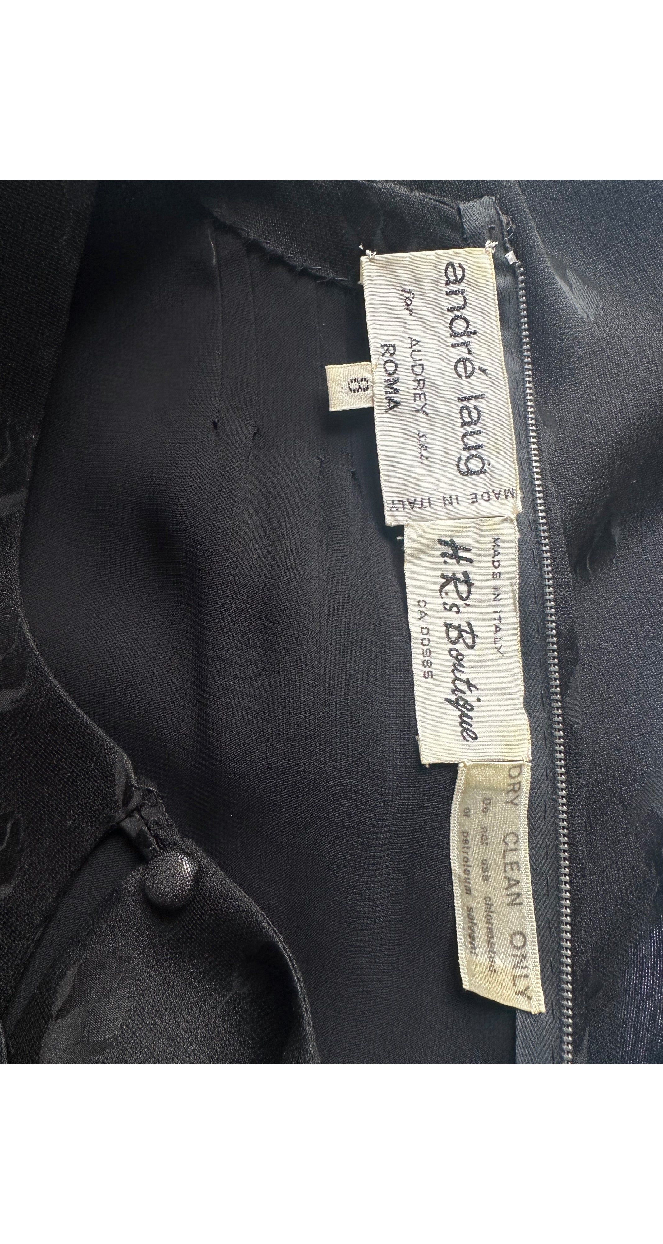 This 1970s André Laug for Audrey short sleeve top was made in Italy of black silk, and originally purchased at H.R.'s Boutique (Holt Renfrew). It features short flutter sleeves, pintuck detailing at the shoulders and a subtle flower bud print. The top fastens with two fabric-covered buttons at the neck and a metal zipper at the back. It's in excellent condition, professionally dry-cleaned and ready to wear.