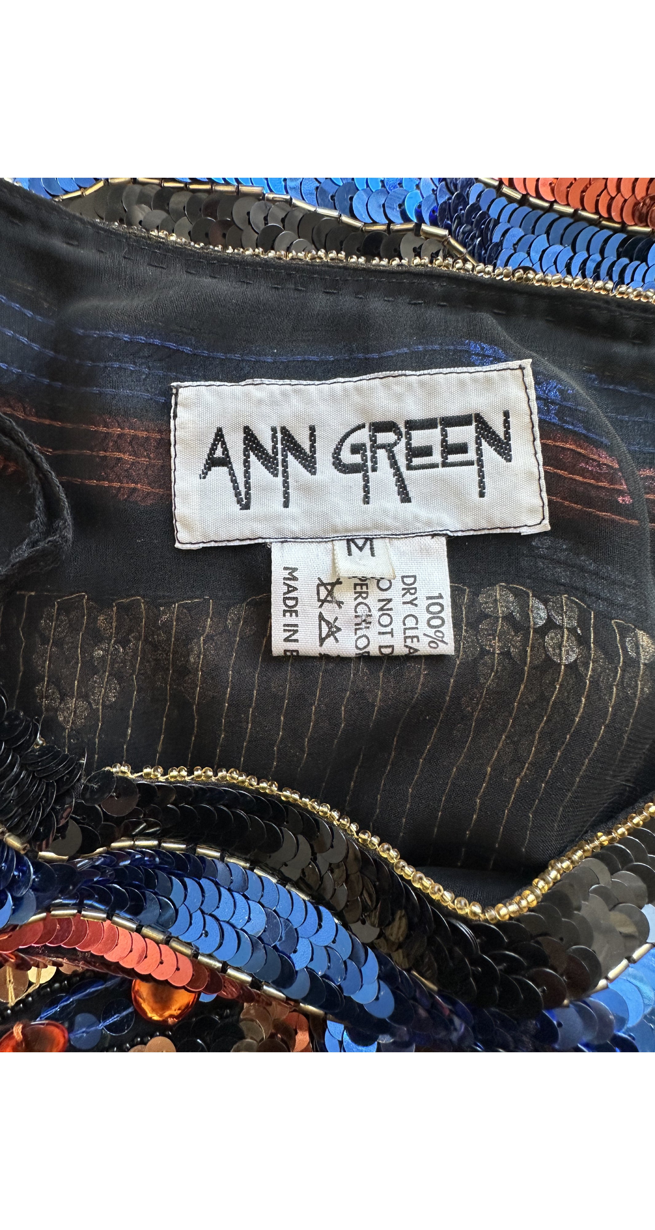 This 1980s Ann Green wide dolman sleeve tunic was made in England of fully embellished black silk chiffon with a King Tut pharaoh design. It slips over the wearer's head, and can be worn as a tunic top or mini dress. It's in very good condition.