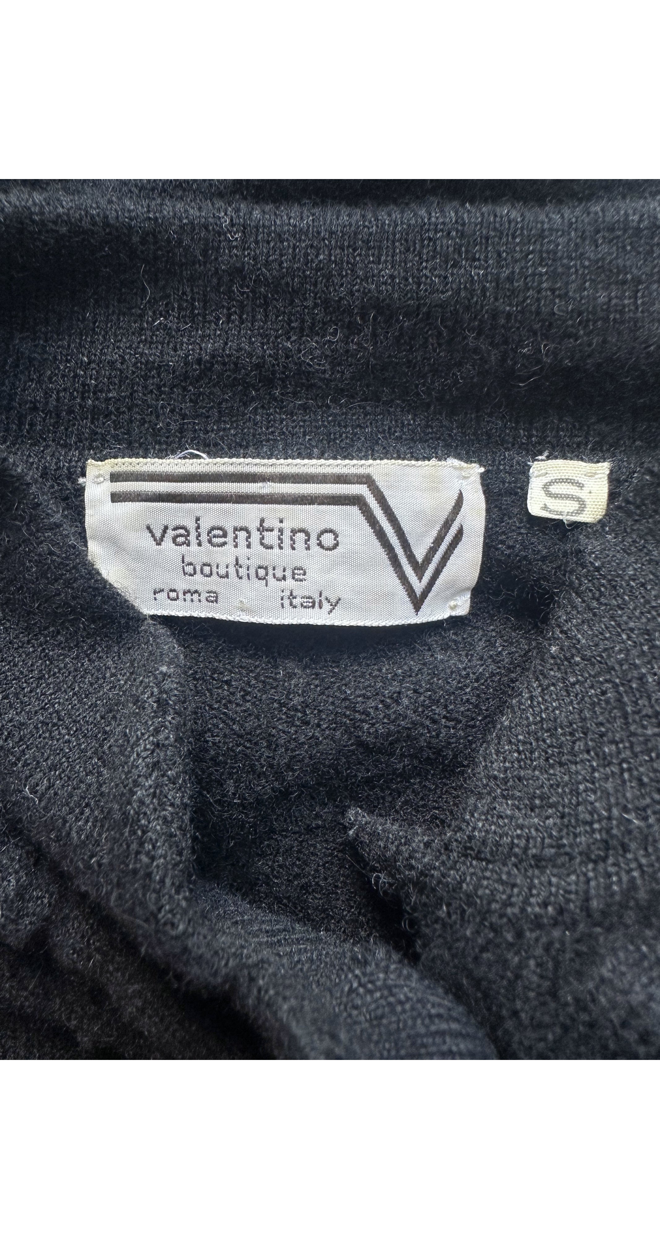 This 1970s Valentino Boutique sweater was made in Italy of black cashmere knit (likely a wool blend) with Swiss dots around the shoulders. It has a strap sewn around the neck that buttons in a V shape at the neck; hiding Vs into the design is a Valentino signature. The sweater pulls over the head and fastens with four buttons at the neck. It's in excellent condition. clean and ready to wear.