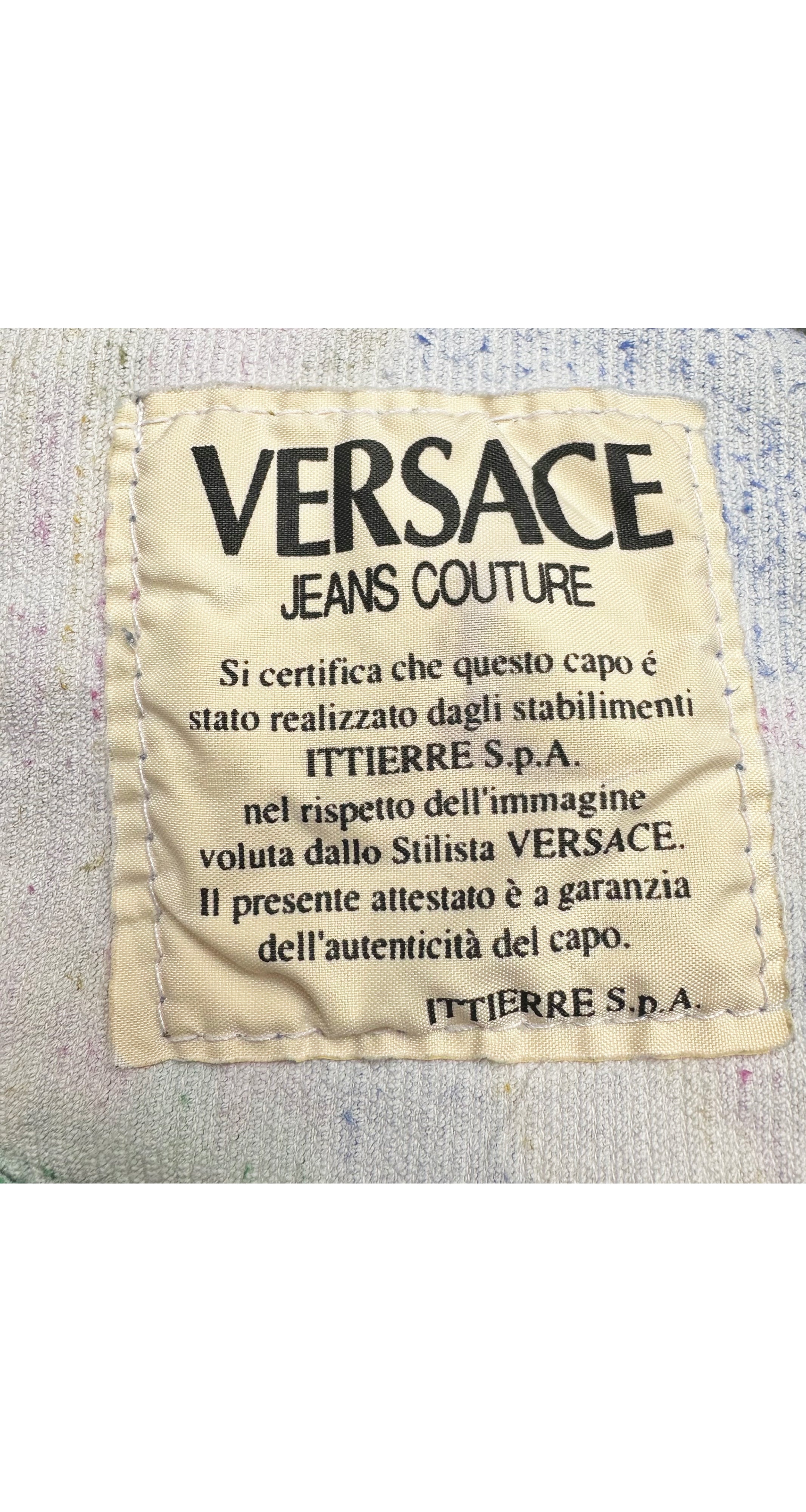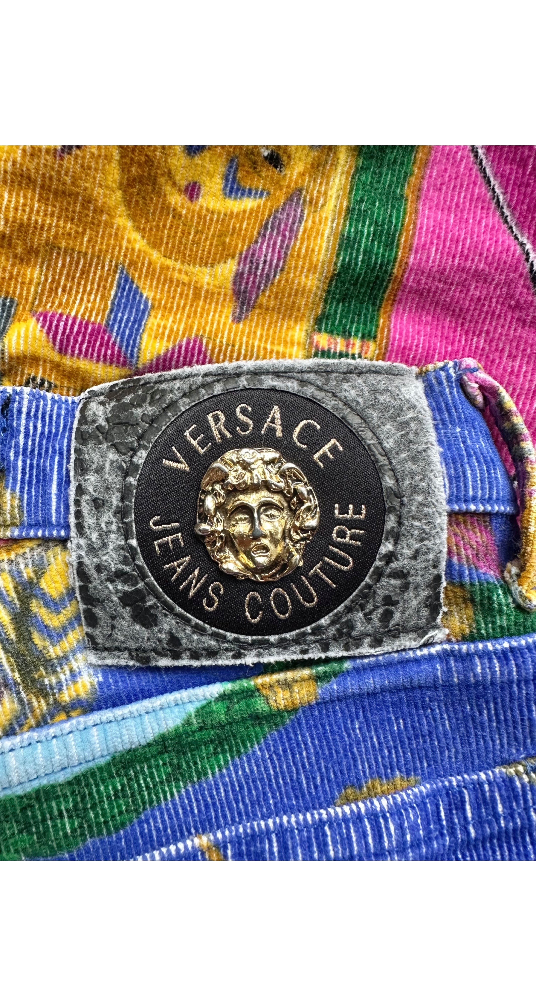 These early-1990s Gianni Versace Jeans Couture cropped pants were made in Italy of a 96% cotton/2% nylon/2% elastane corduroy with multicolored circus print. They're high-waisted, with two front pockets and two back pockets. They fasten in the front with a metal zipper fly and Medusa head button at the waistband. The "VERSACE JEANS COUTURE" Medusa head patch is on the back left side of the waistband. There is significant wear to the patch but they're otherwise in very good, clean condition with only light signs of wear.