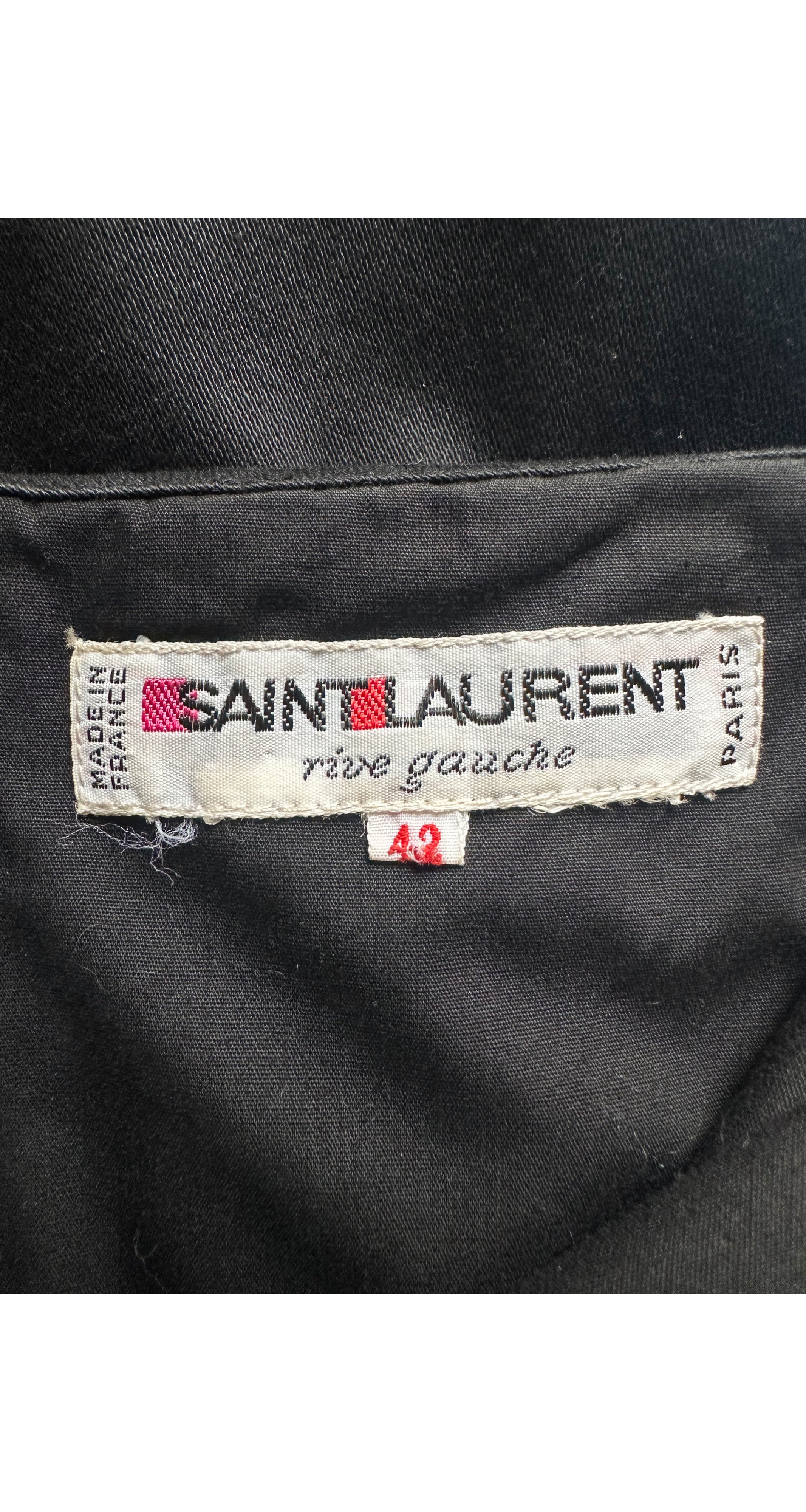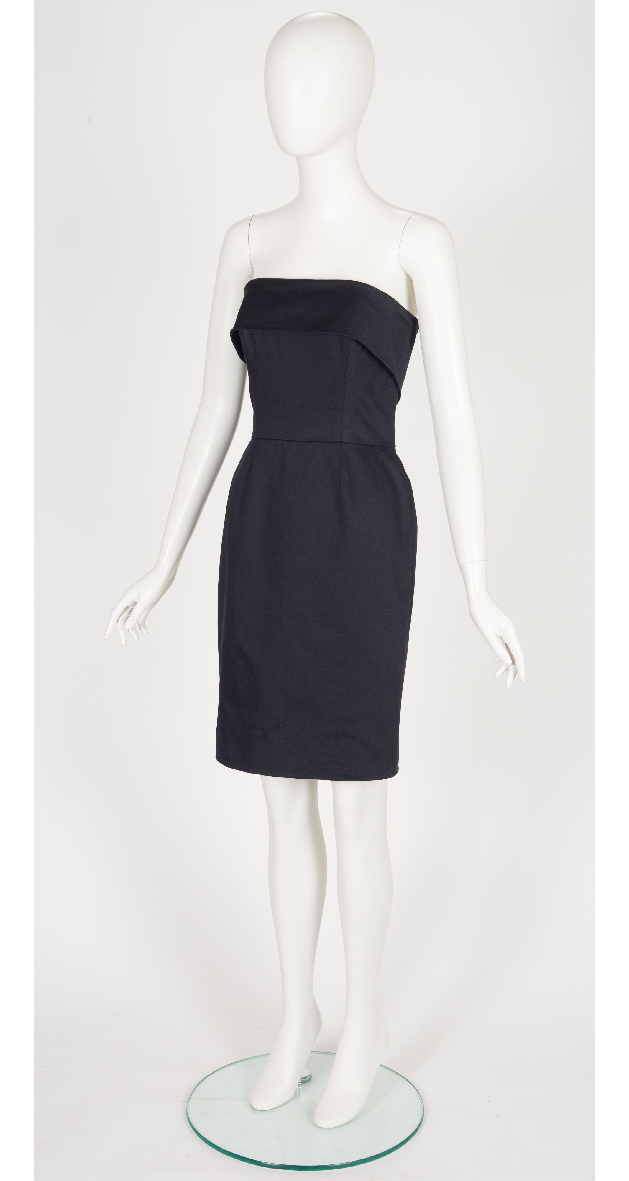 This 1987 S/S Yves Saint Laurent Rive Gauche bustier dress was made in France of black cotton. Multiple versions were featured on that season's runway. It has a ribbed bodice that's lined in cotton, and seven buttons fastening the back. It's in excellent condition, clean and ready to wear.