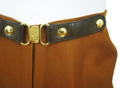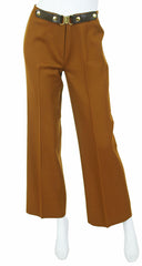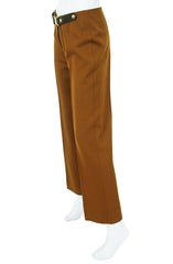 High-waisted worsted wool pants, not a heavy wool but thick enough to keep a nice shape, featuring a wide pleated leg, and leather strap-on trim with a gold metal “C” logo, emulating a belt buckle. These pants are not lined; since the wool is so finely woven it is a non-itchy wool. The colour is medium brown. These are at a discounted price simply because the label is missing.
