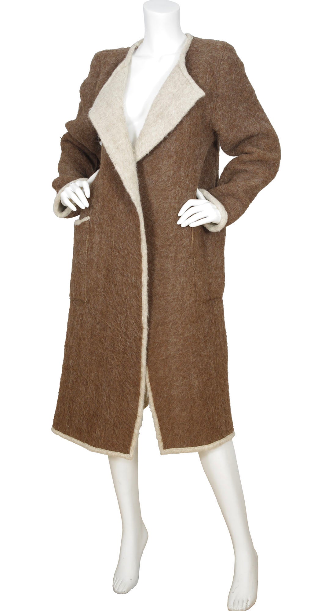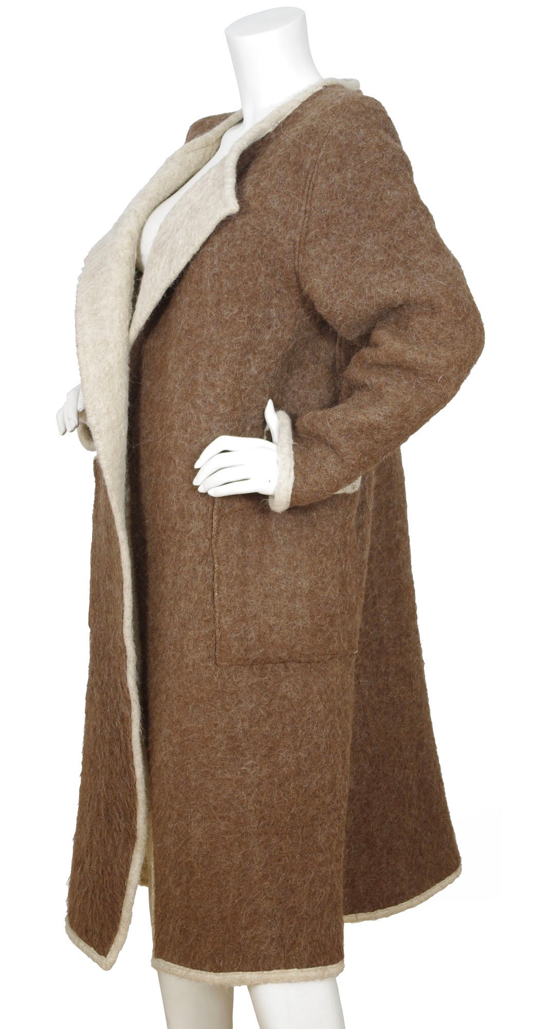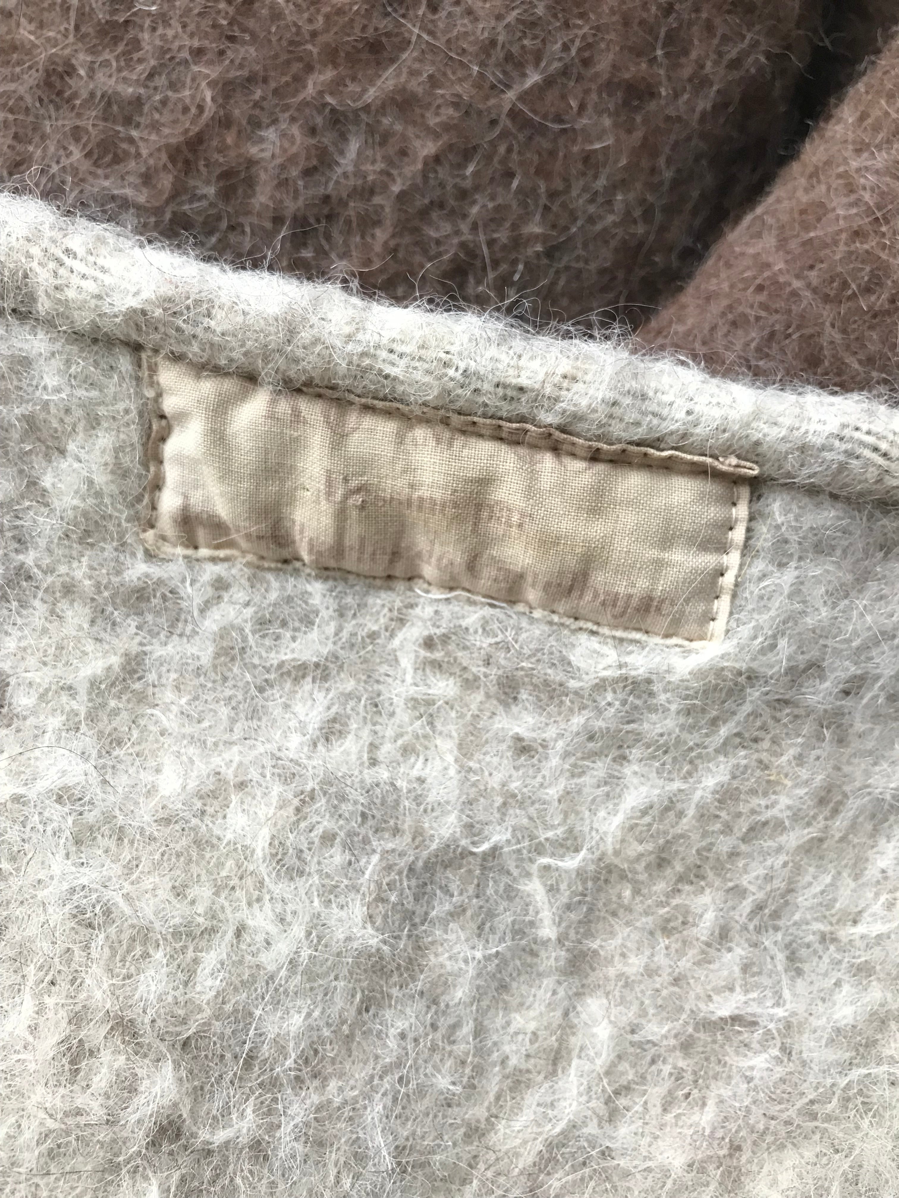 This wool blanket coat is a rare early piece by Jean-Charles Castelbajac for Ko & Co, a label founded by the designer’s mother. Dating to the mid-late 1970s, it has an open oversized style with no closures, two deep front pockets, and a brown exterior with an unlined beige interior and trim. There is one small moth nibble on the left arm that is disguised by the texture, making it only noticeable under very close inspection. Otherwise, it’s in very good condition, professionally dry cleaned, and ready to wear.