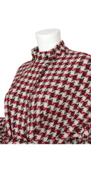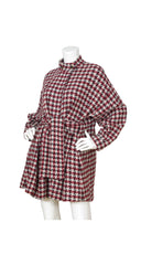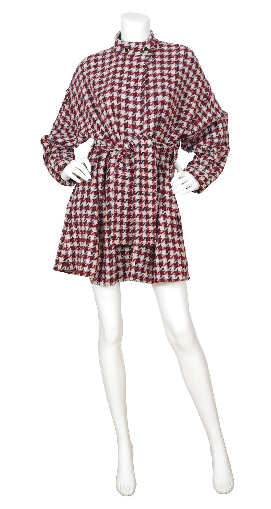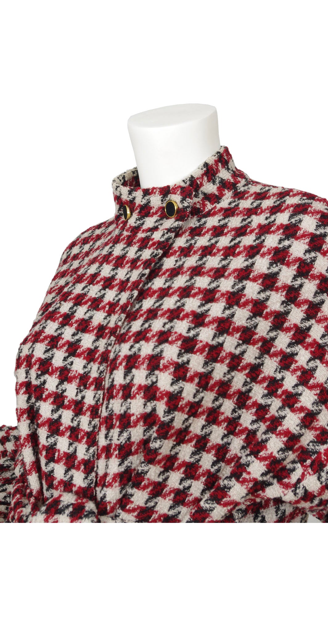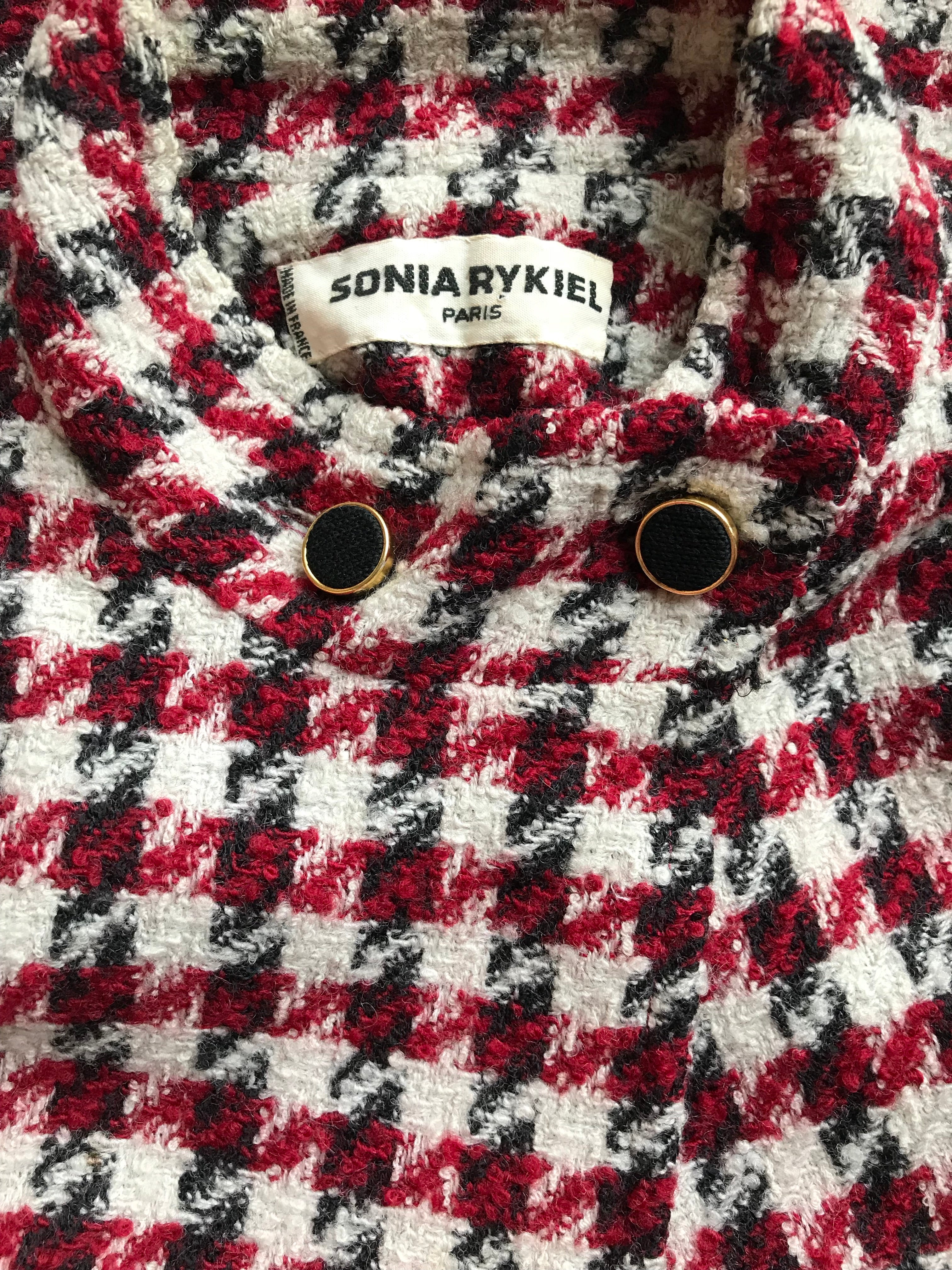 This Sonia Rykiel jacket was made in France in the 1980s. It is 98% wool (2% polyamide) in a black, light beige, and burgundy houndstooth, and unlined. It is labelled a size 40, but could fit a number of sizes; it measures 33” in length, with 20” sleeves from the shoulder seam to the cuff, and drop shoulders that measures 24.5”. The bust is 54” laying flat, and it comes with a tie belt to cinch the waist in the front, leaving a swing in the back. It has a high neck that does up with two buttons. It is in excellent condition, freshly dry-cleaned, and ready to wear.