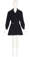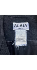 This 1990-91 F/W Azzedine Alaïa coat was made in Italy of black wool and featured on that season's runway. It has large pointed lapels, a black viscose/acetate blend satin lining, a zipper pocket on the right side, and a lace-up back. It fastens in a wrap style with two interior buttons and four buttons on the left side of the waist. There's a button at each cuff. The buttons have been replaced but are similar to the originals, and the wool shows light signs of general wear. Overall, it's in very good condition, professionally dry-cleaned and ready to wear.