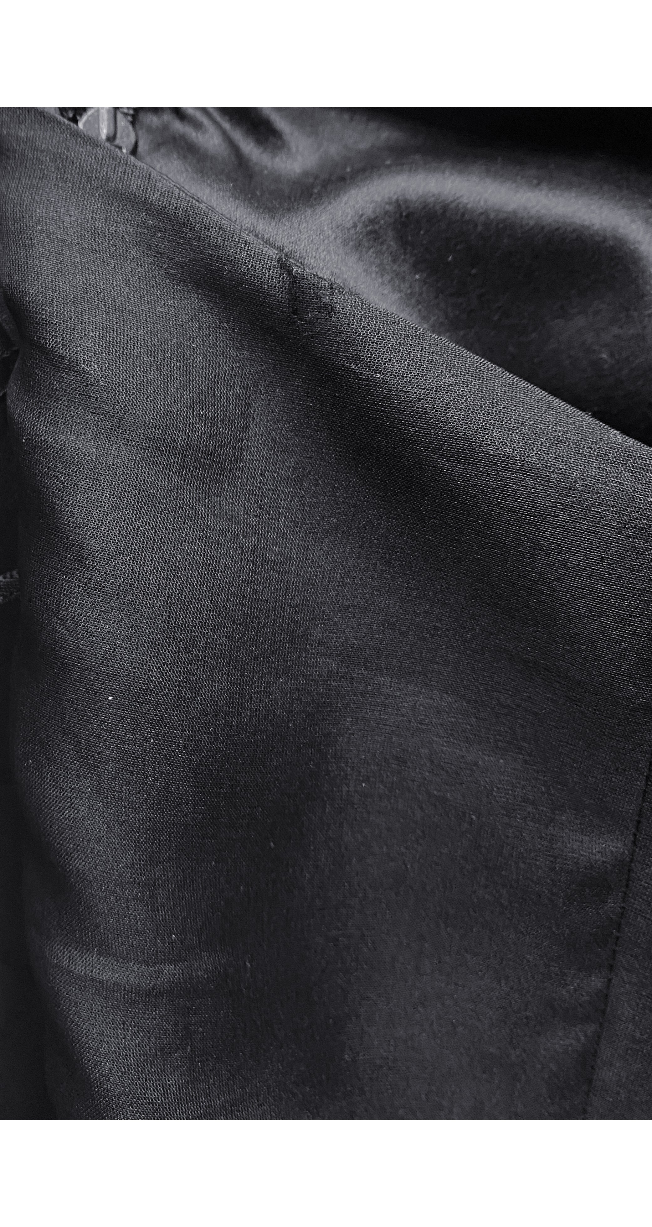 This cocktail dress was made in Australia by Jayson Brunsdon. The silk organza bustier has additional organza that ties into a dramatic bow on one shoulder. The full skirt is comprised of two layers of silk organza. The dress is fully lined in silk, does up the left side with a concealed zipper and comes with its original belt. It is in very good condition overall, with only one 0.5cm x 0.5cm tear in the organza on the back of the bustier (see the last photo). It has been professionally dry-cleaned and is ready to wear.