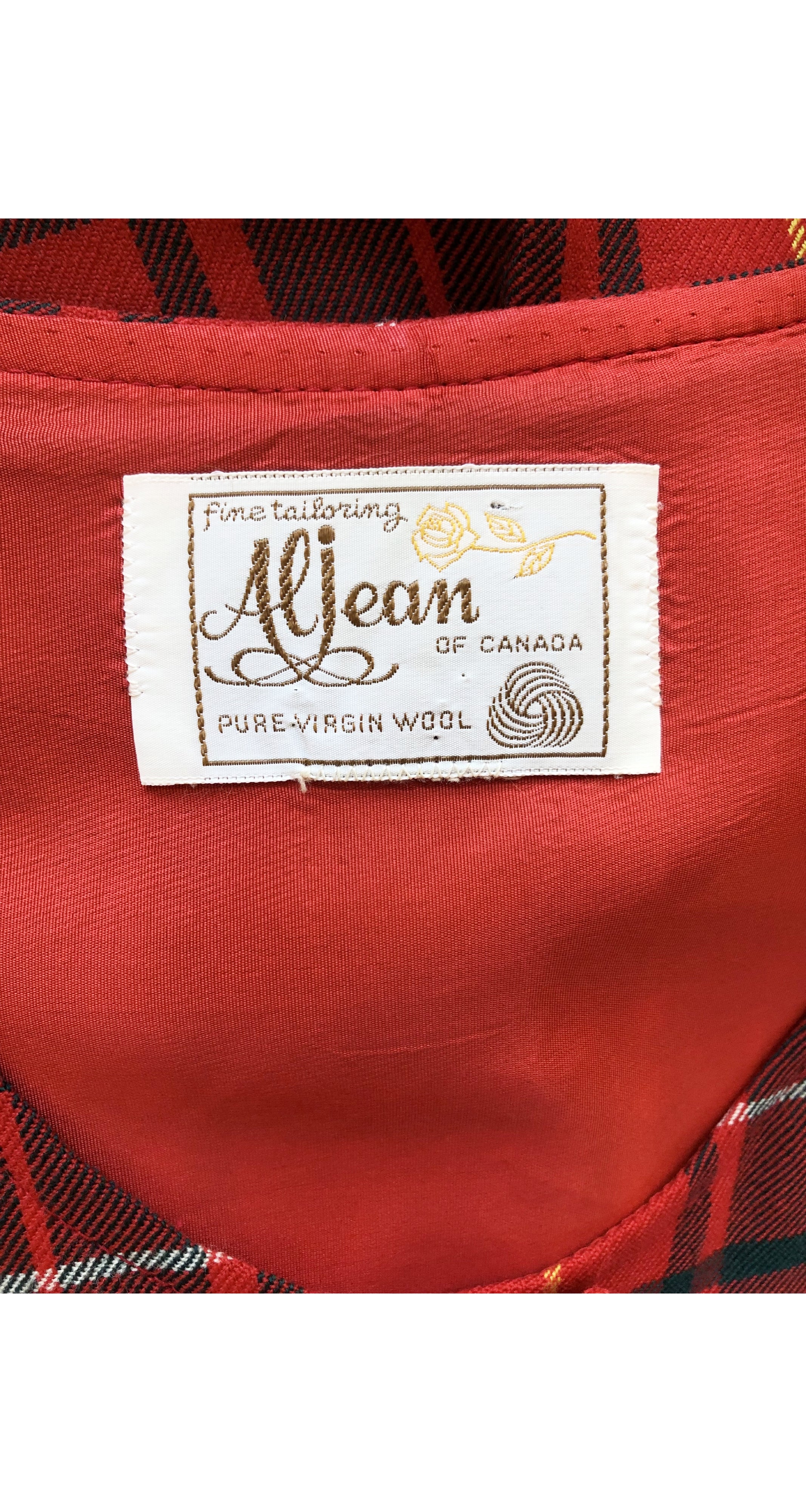 This 1970s Aljean red plaid jumpsuit has a pleat down each leg, six buttons up the front, and includes its original adjustable belt. The top is lined. It's made from pure wool. It is in excellent condition, has been professionally dry-cleaned and is ready to wear.
