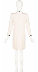 1980s Cream & Black Silk Crepe Scalloped Trim Dress Coat
