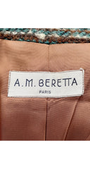 This 1980s Anne-Marie Beretta jacket is striped blue, brown, and cream bouclé wool. It features pointed sleeves, a pocket on each side, and an inverted pleat at the back. It fastens in the front with four snaps. The jacket is in very good condition, has been professionally dry-cleaned and is ready to wear.