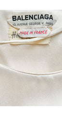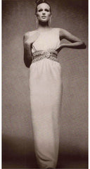 This 1967 Balenciaga haute couture evening gown was numbered "102529" and originally sold at Holt Renfrew. It's made of ivory silk and has an embellished waistband with cut-outs at the sides. It fastens with hook-and-eyes up the left side, at the left shoulder, and back of the skirt.