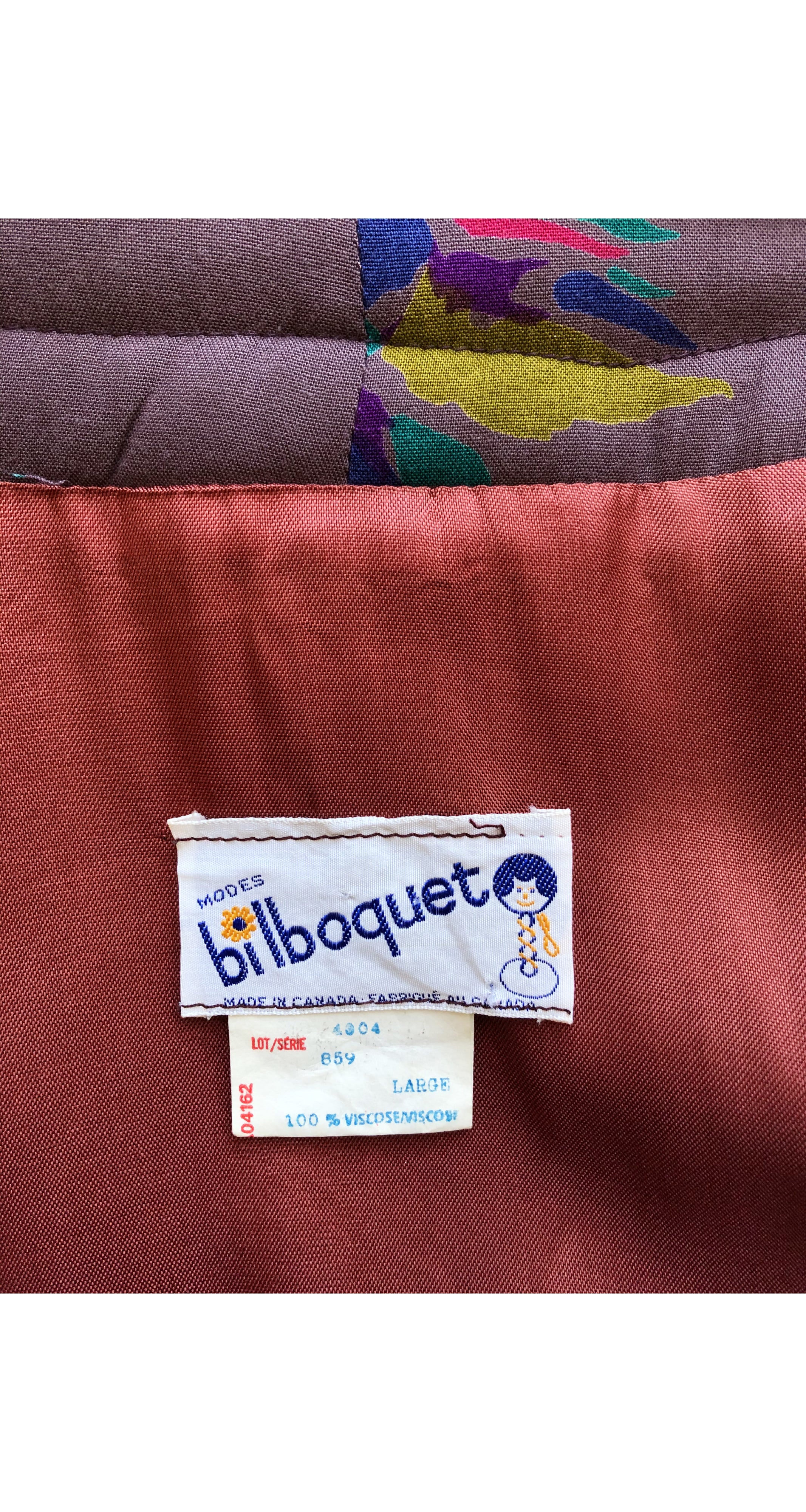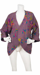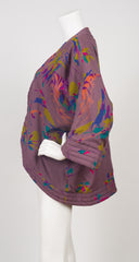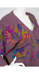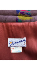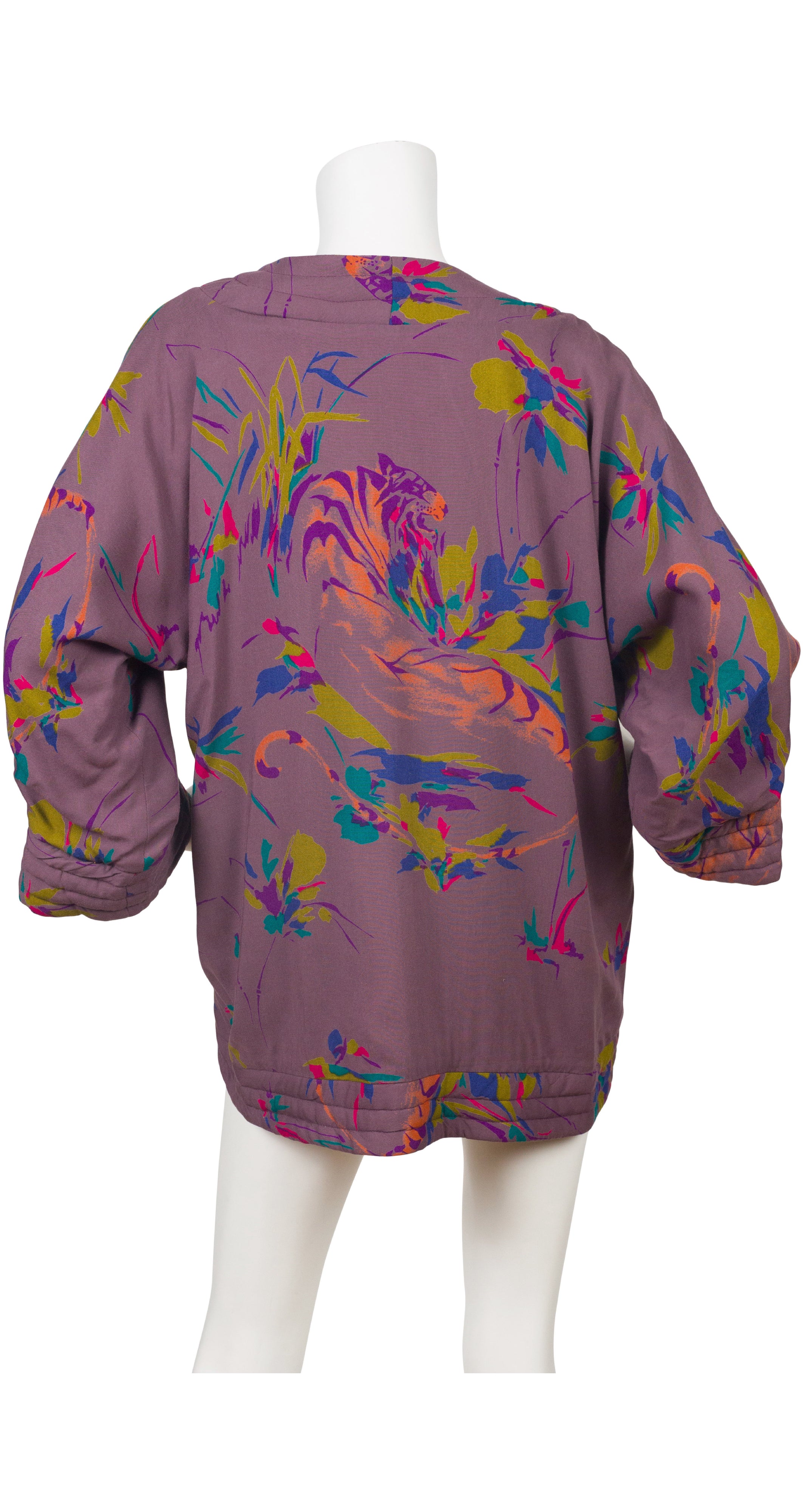 This 1980s Japanese-inspired jacket was made in Canada by Bilboquet. It's a dark puce viscose jersey with an acetate lining, quilted trim, and wide sleeves. It features an abstract print with tigers throughout. There are no closures. It's in excellent condition, has been professionally dry-cleaned and is ready to wear.