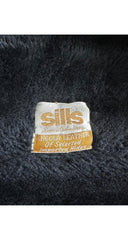 This early-1970s Sills by Bonnie Cashin coat is made from black angola leather with genuine raccoon fur trim and black sherpa lining for additional warmth. It has an A-line shape and a pocket on each side. It fastens in the front with five of Cashin's signature brass turnlocks.