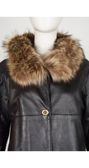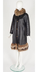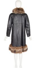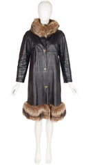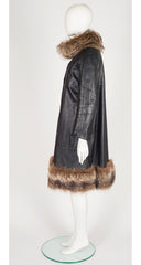 1970s Turnlock Black Leather Fur Trim A-Line Coat