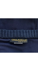 This 1980s Callaghan dress was made in Italy of unlined navy blue ribbed viscose jersey. It has dolman sleeves, and a ribbed knit neckline with ruching. It slips over the wearer's head. It's in very good condition, clean and ready to wear.