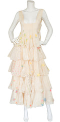 This Catherine Buckley cream floral blouse and pinafore tiered ruffle dress set was made in England in the 1970s. It is unlabeled but instantly recognizable to her devotees as part of her "FRAGILE" collection, where she used antique jacquard lace dating from 1905-1935. Both pieces are lined in silk and zip up the back with a metal zipper. The blouse features sheer sleeves, ruffle cuffs, and a ruffle collar. The lace on the pinafore maxi dress is stressed in a couple of areas and has a few age marks, but nothing that distracts from its beauty.