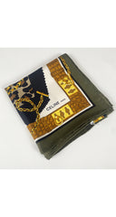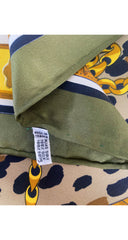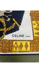 This 1990s Céline scarf features a print of classic accessories from the fashion house on a crocodile and leopard print. It was made in France of pure silk with hand-rolled edges, and comes with its original plastic slip. It measures 34" x 33.5". One stitch has come undone on the edge and there's general wear to the plastic slip, but otherwise, the scarf is in excellent condition.
