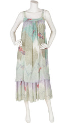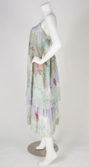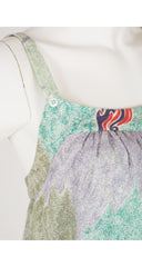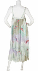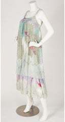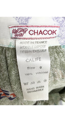 This tiered Chacok sundress dates to the late 1970s/early 1980s. It's semi-sheer, comprised of two layers of viscose voile. The design is called "CALIFE". It slips over the wearer's head and fastens with a shell button on each strap. Made in France, it's in excellent condition, clean and ready to wear.