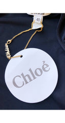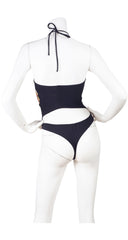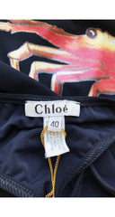 This incredible Chloé by Stella McCartney thong one-piece bathing suit dates to circa 2001. It features a large screen printed shrimp wrapping around the body, as well as a halter neck and cut-out at the lower back. It was made in Italy of a 72% nylon/28% spandex blend. It has been washed but still has its original tag, which is attached with a "Chloé" signature gold chain that can be worn as a bracelet. It is labeled a size 40, but would be best suited for an XS. It is in excellent condition.