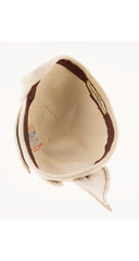 This late-1940s/early-1950s Christian Dior "Copie" (copy) hat was made in France from Italian "Monte Carlo" beige velour felt. It has a large figural leaf on the top. It currently has a hat pin in it, which has left some minor marks around the hole where it's pierced the felt that are only visible when the pin is removed. Otherwise, it's in very good condition.