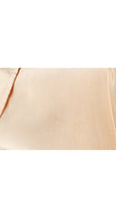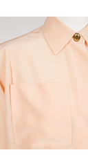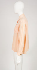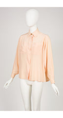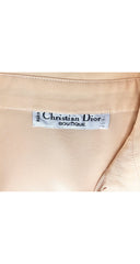 This 1980s Christian Dior Boutique collared blouse was made in France of peach silk with a "CD" logo gold-tone button at the neck and each cuff. It's numbered "57607." It fastens at the front with five shell buttons and has two breast pockets.