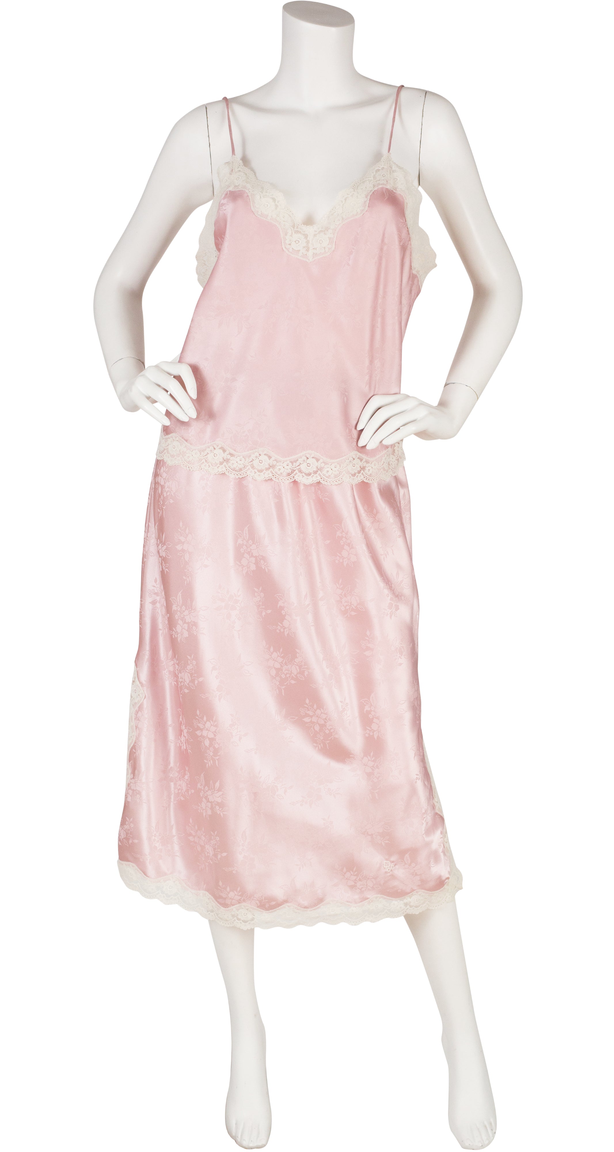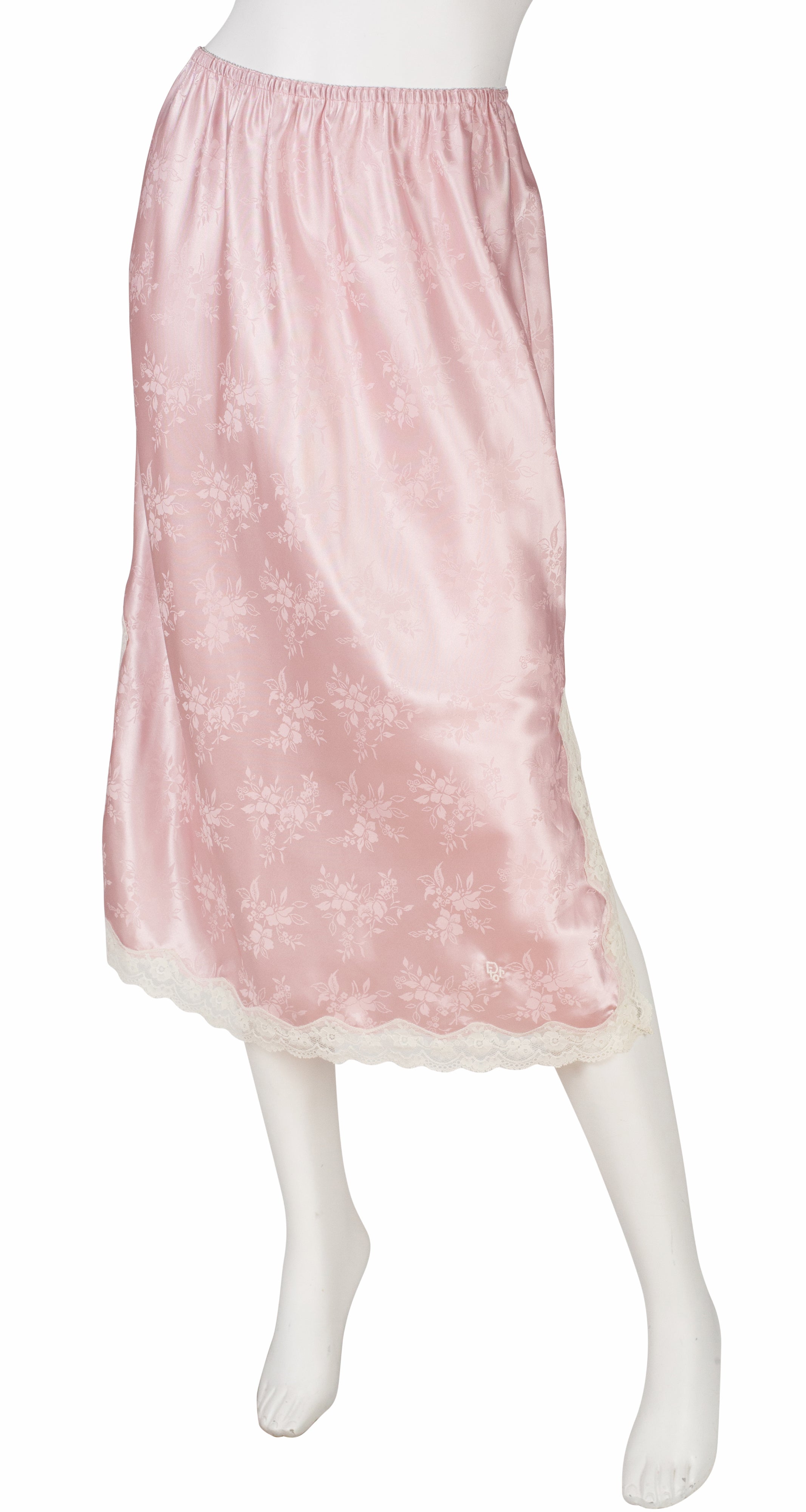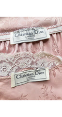This 1980s Christian Dior Lingerie camisole and skirt set was made in Canada of a pink floral jacquard polyester with a cream lace trim. Each piece has a "Dior" monogram embroidered on the bottom left-hand corner. The top slips over the wearer's head, and the skirt has an elastic waistband and a 10.5" slit up each side. The set is in excellent condition, clean and ready to wear.