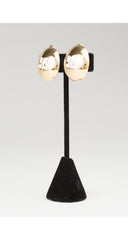 This 1980s Courrèges clip-on earrings are round gold-tone metal with a cream enamel logo. They measure 1 1/8" in diameter and are signed "COURRÈGES" on the back. They're in very good condition.