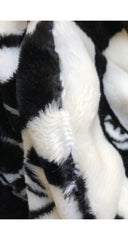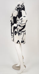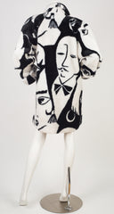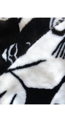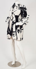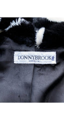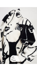 This 1980s Donnybrook coat, as seen on Rihanna in 2015, was made in the USA of black and white faux fur with abstract faces all over. It has a black rayon satin lining, rolled-up cuffs, and one button fastening at the waist.
