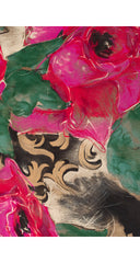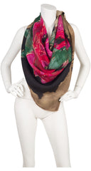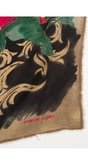 This 1980s Emanuel Ungaro shawl was made from a thin beige wool. It features a rose print in the style of a hand-painted watercolor with pastels. It measures 52" x 51.5". It has quite a few minor pulls and a lingering scent of perfume that the dry-cleaner didn't remove. It is possible that it will come out with further treatment, but we have factored it into the price.