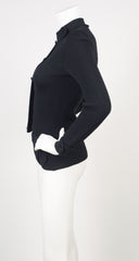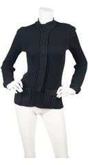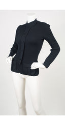 This Emanuel Ungaro Parallele sweater was originally sold at Bonwit Teller. The blue version was featured in a 1970 issue of L'Officiel. It was made in Italy from pure black ribbed wool. It does up the front with a hidden metal zipper and a button at the neck. There are five decorative buttons up the front and an additional button on each cuff. It is in excellent condition, has been professionally dry cleaned and is ready to wear.