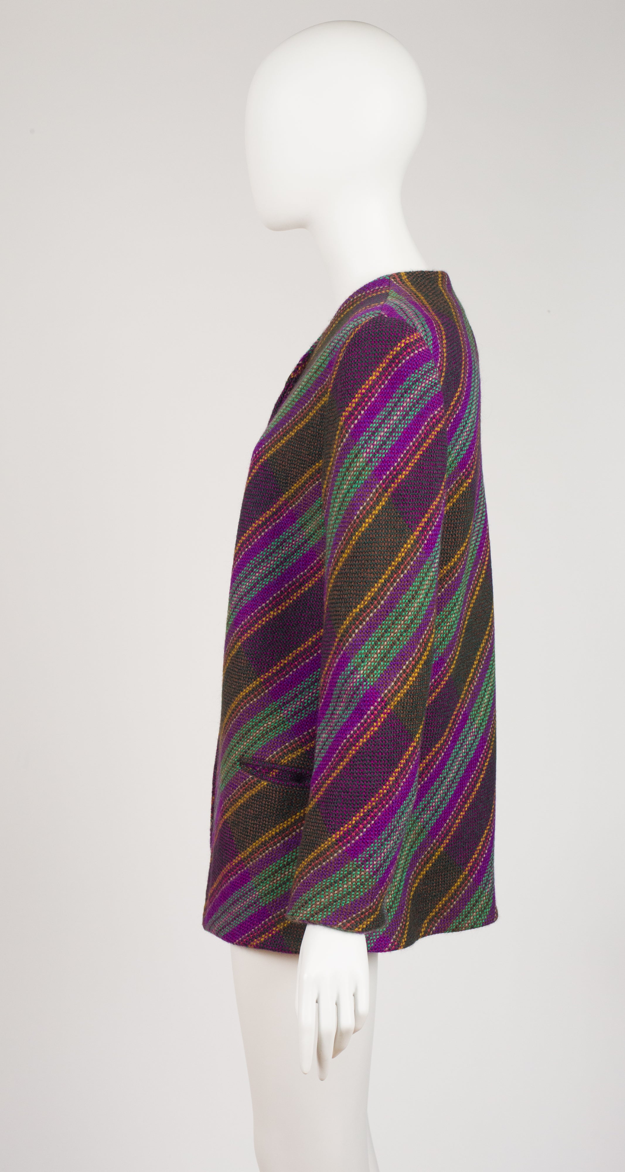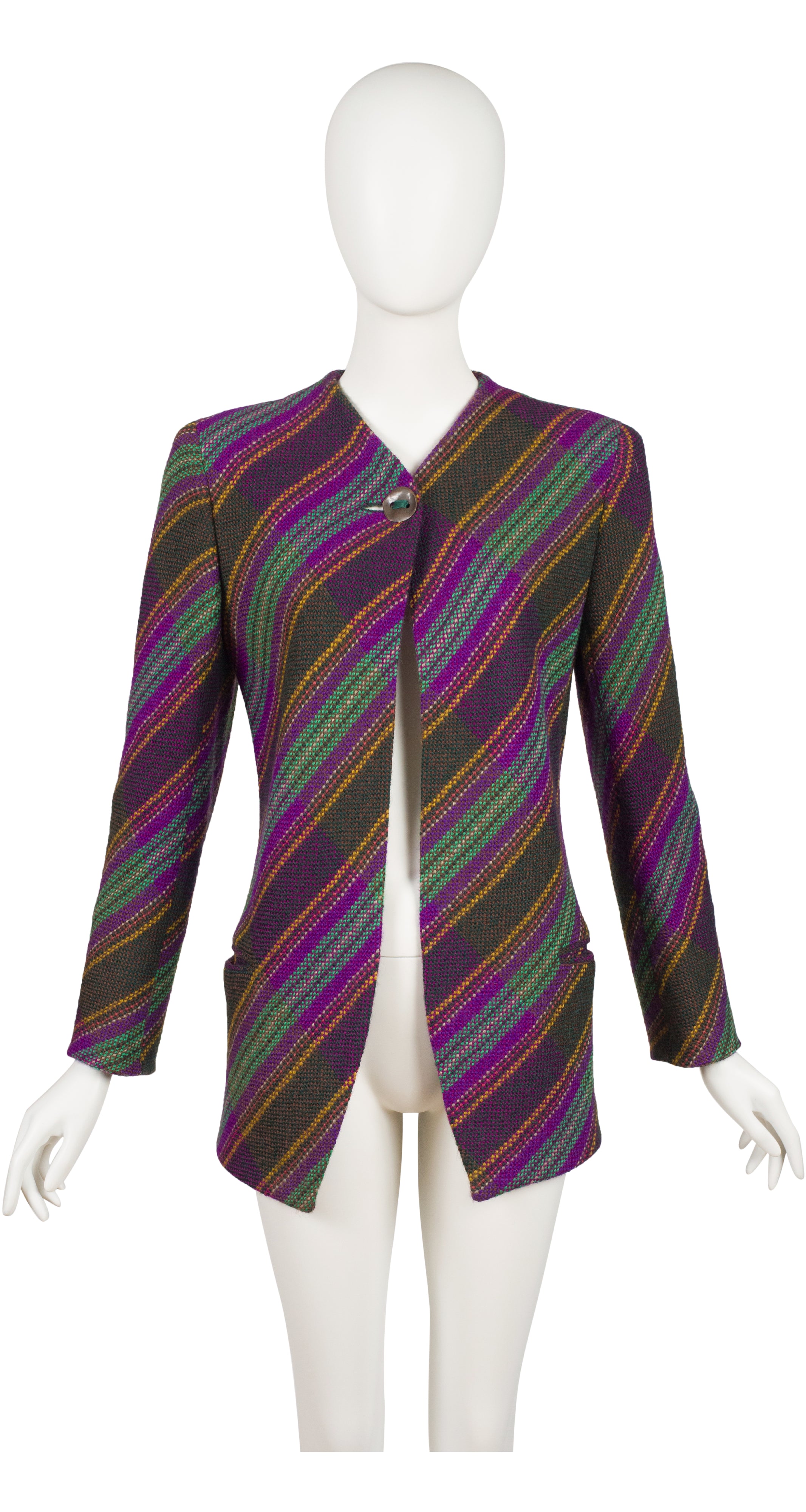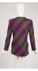 This Emanuel Ungaro Paralele jacket is from the 1994-95 F/W line, and was featured on that season's runway (see embedded video.) It was made in Italy of a striped tweed wool with a dark green silk crêpe de chine lining. It does up with one metal button that's sewn with green satin ribbon, and has a pocket on each side. The jacket is in excellent condition, has been professionally dry-cleaned and is ready to wear.