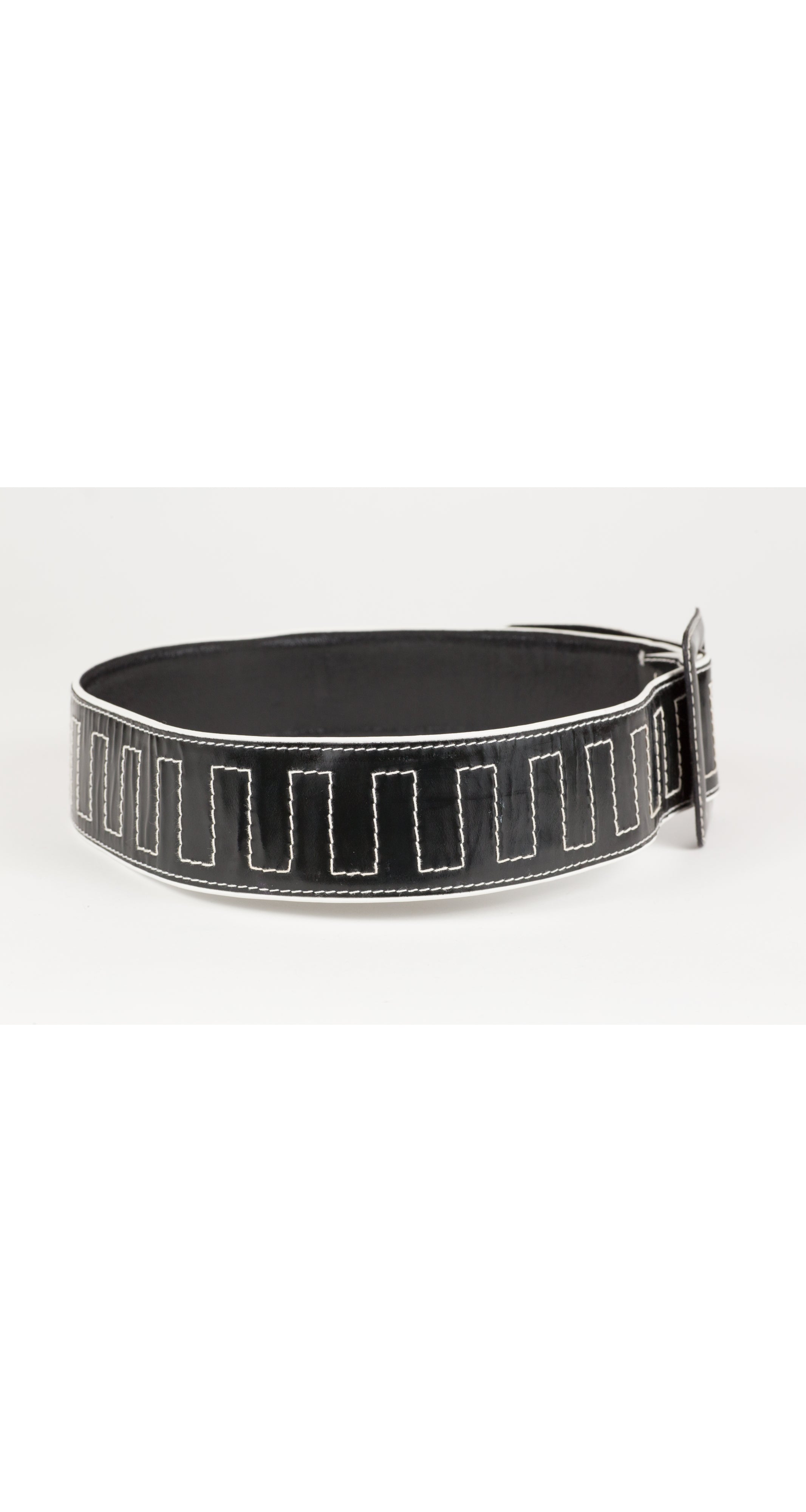 This 1986 Escada adjustable waist belt was was featured in that year's ad campaign. It's black patent leather with a white trim, geometric contrast stitching and black leather backing. It measures 2.25" in width, and fits up to a 31" waist. It's in very good condition with only some light signs of wear.