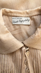 This true couture, completely hand-finished blouse is by Frank Oujezdsky, a Montreal couturier. It is in the style of 1930s fashion, with a pintuck bodice and shoulders structured with very thin padding, though it in fact dates to the 1970s. It features bishop sleeves with 4 buttons on each cuff, and a rounded collar with fine stitching detail and a necktie. It does up with eleven silk and gold buttons on the bodice and three hidden buttons under the bust. Made from cream silk jacquard, it is in excellent condition.