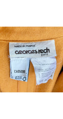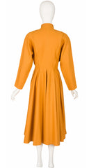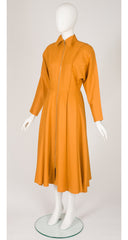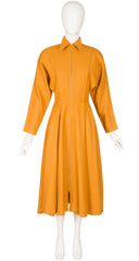 This 1980s Georges Rech dress was made in France of unlined mustard wool. It has long dolman sleeves, a pleated full skirt and a pointed collar. It fastens in the front with a gold metal RiRi zipper that runs the entirety of the dress, and has a pocket on each side. It's in excellent condition, professionally dry-cleaned and ready to wear.