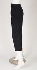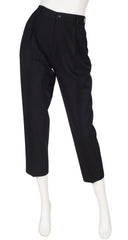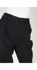 These Guy Laroche Boutique high-waisted cropped straight-leg trousers date to the late-1970s/early-1980s. They were made in France of black wool with a pleat down each leg and pocket on each side. They do up with a zipper fly and a button at the waistband. Overall, they're in very good condition with just some minor wear around the cuffs (see the last photo.)