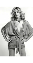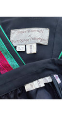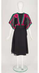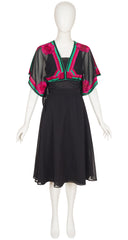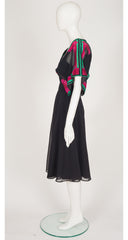 This 1970s Janice Wainwright at Forty Seven Poland Street top and skirt set was made in England of black polyester chiffon. The short flutter sleeve top has an Art Deco-style peony green, red, and pink embroidered trim. It slips over the wearer's head and ties at the right side. The flared skirt is lined in acetate. It fastens with a zipper at the back and a hook-and-eye at the back of the waistband. Both pieces are in excellent condition, clean and ready to wear.