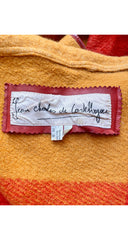 This 1980s Jean-Charles de Castelbajac blanket coat was made in France of unlined orange and mustard plaid wool. It has a snap-up double hood, a pocket on the right side and leather straps to fasten the neck (with no other closures.) It shows signs of light general wear, and the leather straps are a bit stiff, but overall, it’s in very good condition. It has been professionally dry-cleaned and is ready to wear.