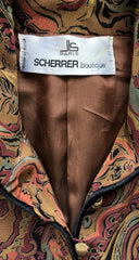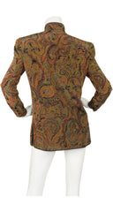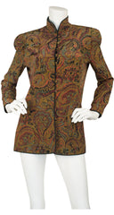 This 1980s mandarin collar jacket is by Jean-Louis Scherrer Boutique. It was made in France of fully-lined silk (possibly a rayon blend) with an earth-tone paisley print. It's numbered "B 80984." It features black rope trim, puff shoulders, thin built-in shoulder pads and a 5.25" slit up each side. It does up the front with eleven buttons and has an additional three buttons on each cuff. It does have a 1mm x 3mm hole on the back that gets lost in the print, but we would still consider this jacket to be in excellent condition. It has been professionally dry-cleaned and is ready to wear.