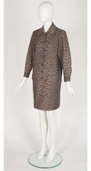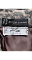 This early-1990s Jean-Louis Scherrer Boutique collared dress was originally sold at Lily Simon and numbered 039751. It was made in France of brown and gray leopard print wool; the body is lined and sleeves are unlined. There are two front flap pockets. It slips over the wearer's head and fastens with seven buttons in the front and a button on each cuff. The buttons are signed "SCHERRER". The pocket's buttons aren't original (we photographed them unbuttoned.) It's otherwise in excellent condition, professionally dry-cleaned and ready to wear.