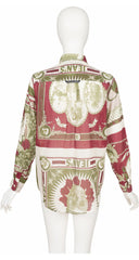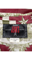 This 1990s Jean-Paul Gaultier Jean's men's button-up shirt was made in Italy of a semi-sheer white cotton voile with a burgundy and olive green graphic print. The print includes skulls, pin ups, Champs-Élysées, and "The Wild Ones"-era Marlon Brando. It has two breast pockets, and fastens with six buttons in the front and a button on each cuff. It's in excellent condition, clean and ready to wear.